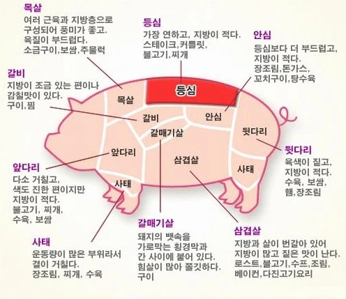 돼지고기는 소나 닭처럼 우리에게 단백질을 제공해주는 아주 친숙한 공급원인데요. 하지만 부위별로 조금씩 구분해서 먹는 것이 좋다고 합니다. 삼겹살이나 목살, 갈비 쪽은 맛은 있지만 아무래도 지방함유량이 높아 체지방의 증가를 낳을 수 있으므로 너무 잦은 섭취는 주의하셔야 하겠습니다.