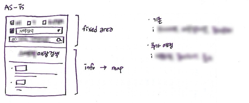 보통 화면 기획을 할 때는 스토리보드를 그리기에 앞서 손으로 먼저 그려본다. 이상하게 눈으로 문서만 볼 때와 손으로 직접 그려볼 때, 파워포인트로 SB를 작성하거나 인비전으로 프로토타입을 올릴 때 각각의 단계에서 느끼는 게 있다. 그래서 무조건 as-is와 to-be의 대략적인 형태는 손으로 그려두는 편이다. 현재 레이아웃과 포함된 요소들을 간단히 그려내고, 요건을 반영할 부분과 덜어내거나 수정해야 할 부분을 가려낸다.