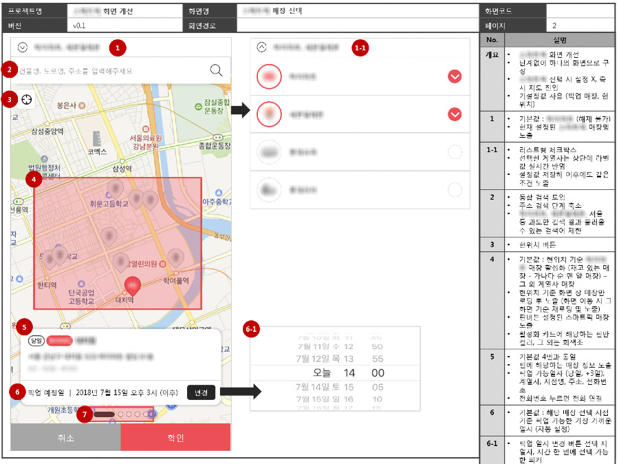 상품 픽업 서비스는 모바일 앱에서 우리 회사의 상품을 구매하면, 원하는 위치의 계열사 오프라인 매장에서 픽업해 갈 수 있게 해주는 서비스다. 계열사가 하나 추가될 예정이었는데 겸사겸사 화면도 리뉴얼해보자는 거였다. 나름 처음으로 수행하게 된 대형 업무였다. 기존에 진행하던 일도 당연히 의미 있었지만, 내가 드디어 화면을 기획해서 앱에 올려볼 수 있는 기회를 얻은 거다. 당시에는 업무 R&R이 명확히 정해지지 않은 상태라 팀에서 이것저것 일을 시켜보고 있었다. 이 일을 잘 해내면 계속 기획 업무를 할 수 있을 것 같았다. (기회다!)