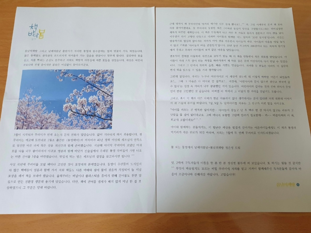 처음 받은 꾸러미에는 남해의 벚꽃 소식으로 시작하는 편지,
