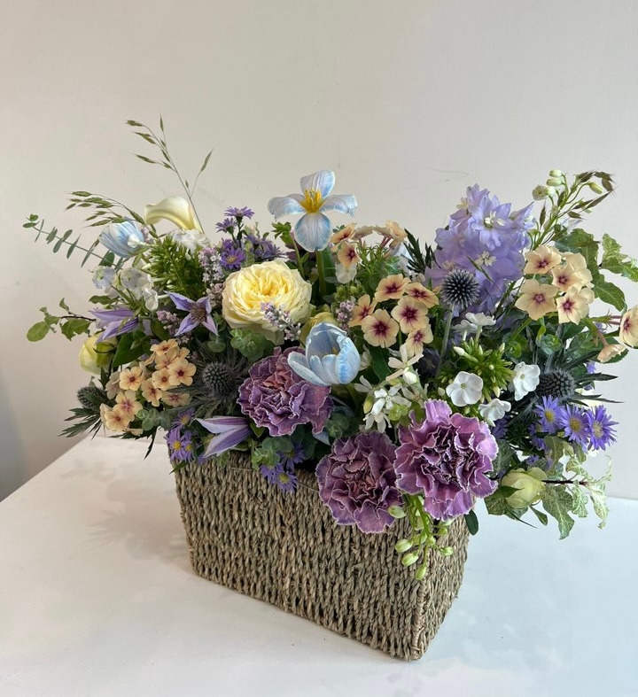 “빈 공간을 채울 꽃으로 보라색 톤을 고려해서 과꽃을 샀어요. 지난주에는 파란색으로 썼던 옥시를 이번에는 흰색으로 준비했고요. 델피늄은 어떻게 나눠 쓰면 좋을지, 클레마티스는 얼굴 방향을 어떻게 둘지 고민해 봐요. 이 꽃의 향기 좀 맡아보실래요?”
