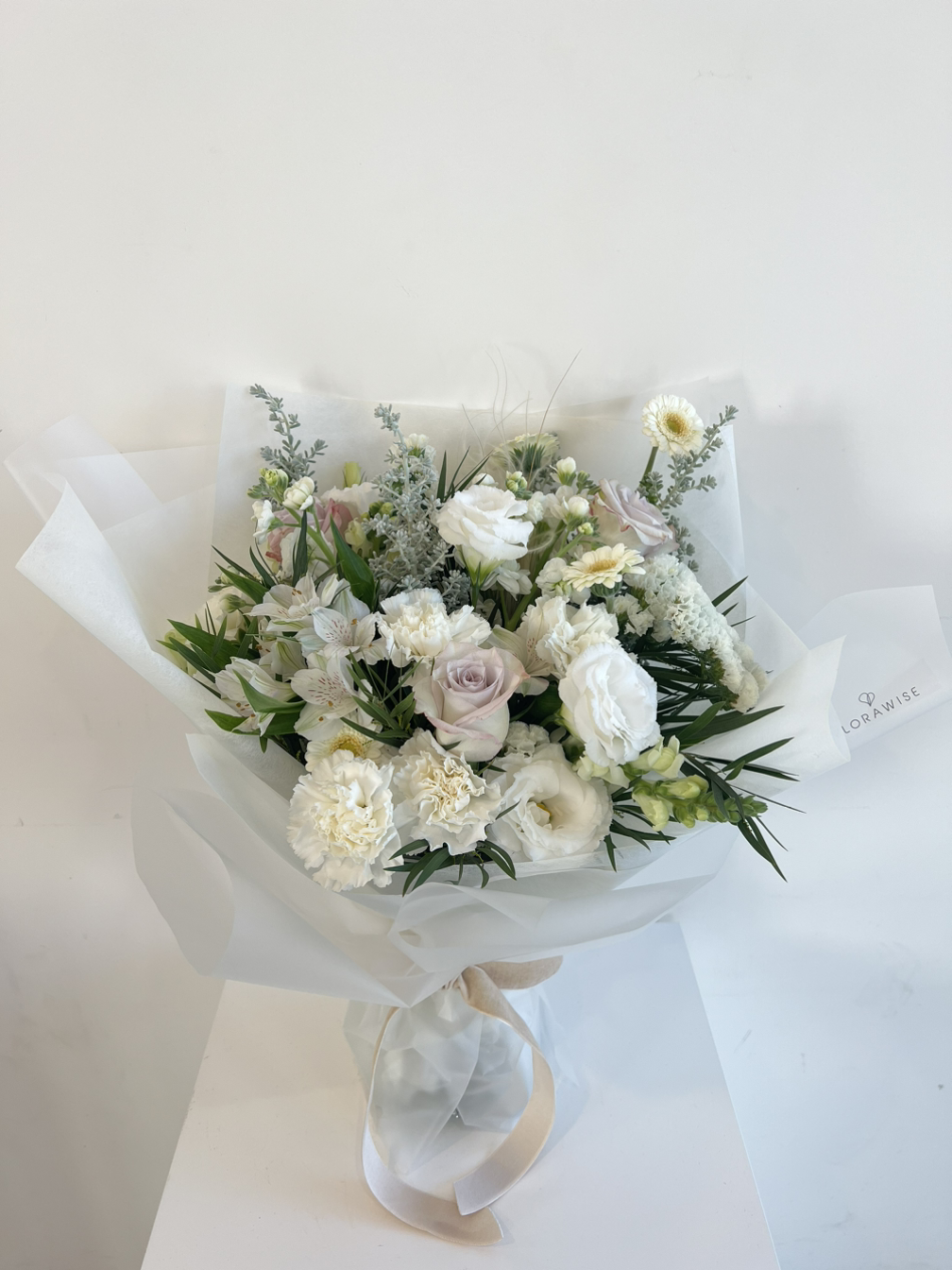 “보통 흰색 꽃들로만 다발을 만드는 경우가 흔하지는 않잖아요? 국화랑 여기 있는 금어초는 근조화환에 많이 쓰이기도 하고요.. 오늘은 우아하고, 고상하고, 품위 있게 어레인지 할 수 있는 흰색 꽃들의 매력을 언니한테 알려주고 싶었어요. 그래서 미리 준비해 놓은 건데.. 언니한테는 오히려 추모의 이미지가 더 각인될 수도 있겠네요.”