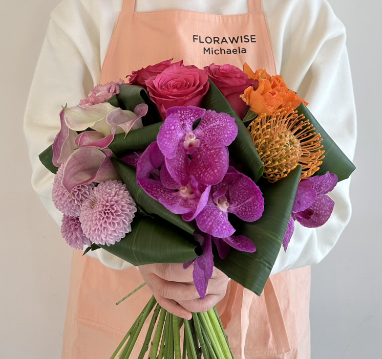 “섹션 핸드타이드는 말 그대로 꽃을 그룹으로 묶어서 다발을 만드는 방법이에요. 언뜻 생각하면 부자연스러울 것 같잖아요? 꽃의 종류, 색상, 크기 등을 고려해서 균형감 있게 배치하면 오히려 자연스러운 느낌을 줄 수 있어요. 우리는 로라장미, 거베라, 소국, 핀쿠션, 카라, 퐁퐁, 반다, 리시안셔스를 사용할 거예요. 그전에, 섹션을 구분해 줄 엽란을 먼저 준비할게요.”