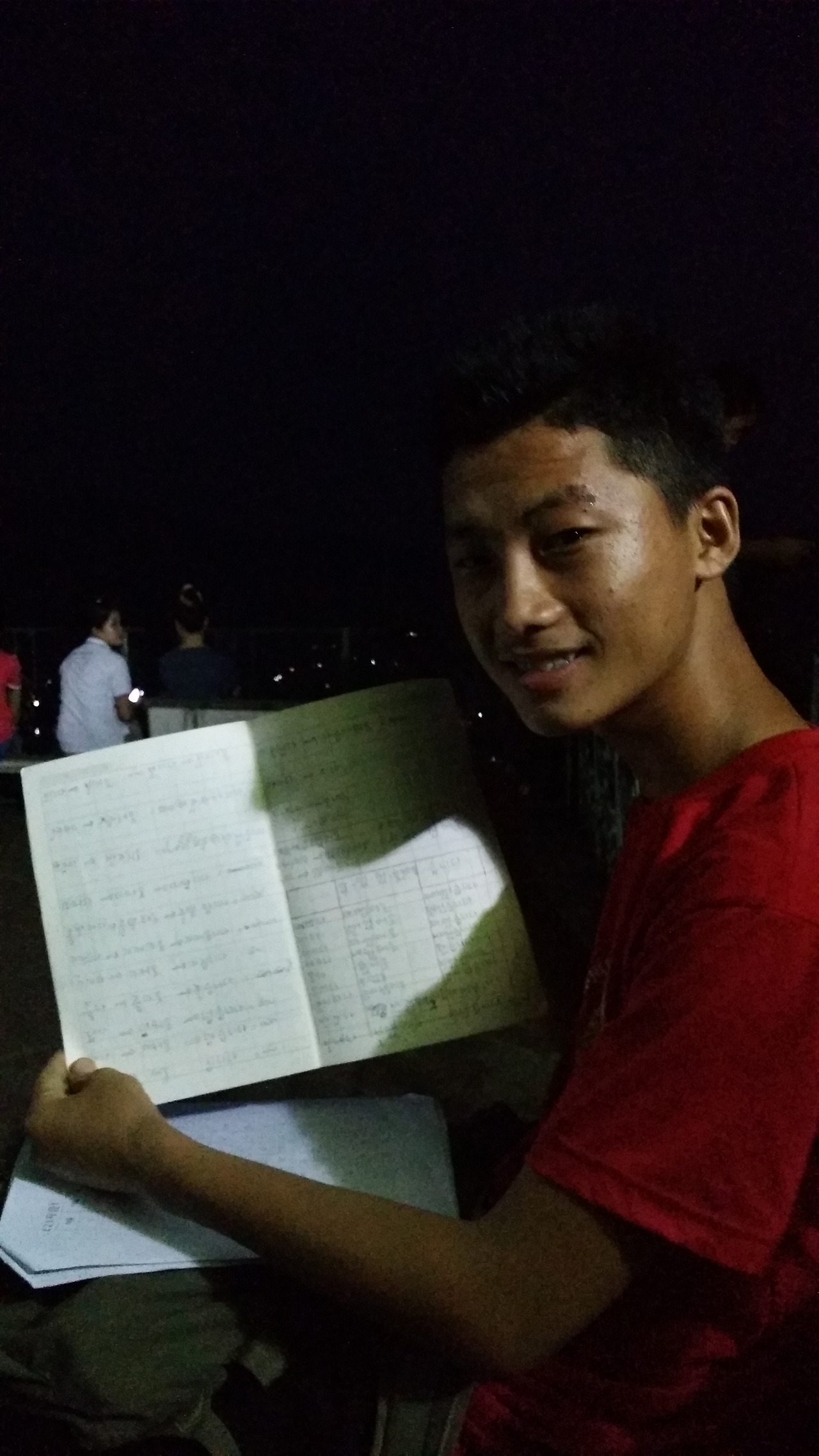 넋을 잃고 메콩강으로 지는 일몰을 바라보는 사이 금방 해가 지고 대부분의 관광객들이 자리를 떴지만 해가 진 푸시산이 궁금해서 앉아있는데 한 학생이 다가와서 한국인이냐고 물었다. 내가 한국인이라고 하니까 자기가 한국어를 공부하고 있는데 한글 발음을 좀 가르쳐 줄 수 있겠냐고 요청을 해 왔다. 한국어교육을 전공하지는 않았지만 국어를 가르치고 있는 내게 부탁을 하다니... 알고서 부탁을 한 것은 아니지만 어쨌든 제대로 부탁을 한 셈이다.