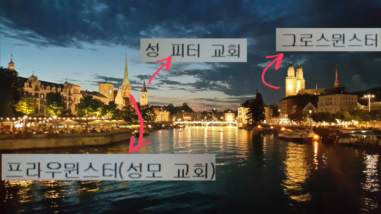 물론, 구입한 지가 7년도 넘는 오래된 노트북으로 나누는 화상통화이니 화질이 오죽했겠냐마는... 그래도 뾰쭉뾰쭉뾰쭉 '프라우뮌스터', '성피터 교회', '그로스뮌스터'의 탑을 보고도 저런 소리를 내뱉다니... 나보다 나이가 10살은 더 많은 친구에게 벌써 노안이 온 것은 아닌가를 의심하며 도저히 참지 못하고 주제넘게 또 한 소리를 했다.