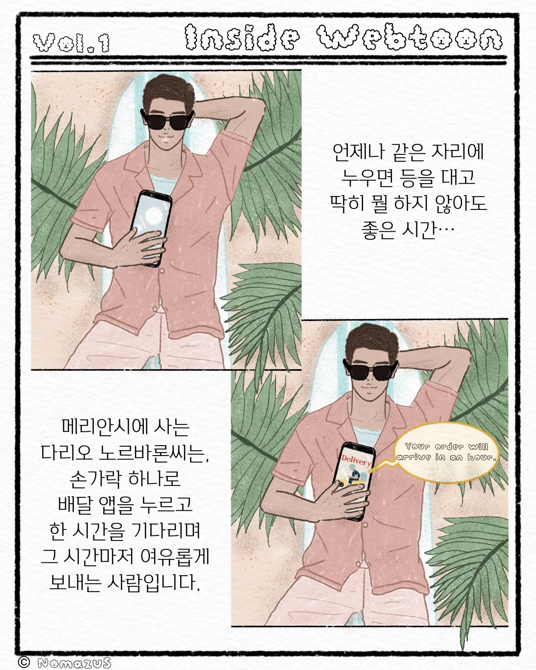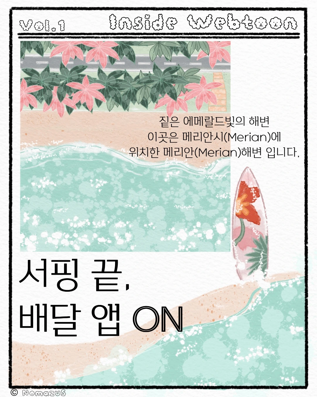 <<Inside Webtoon>>인사이드 웹툰은 창작자의 시점에서한 편의 웹툰이 만들어지기까지의 고민과 뒷이야기를 담은 창작 비하인드 매거진입니다.첫 번째 이야기는 서핑을 즐기는 웹툰 캐릭터 다리오의 일상을 담아봤습니다.Vol 2를 기대해 주세요. :)