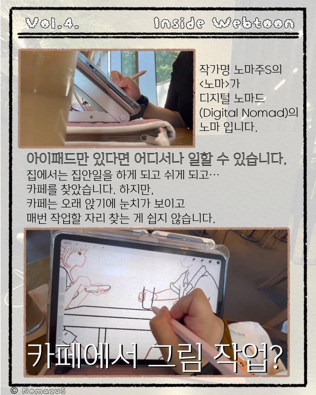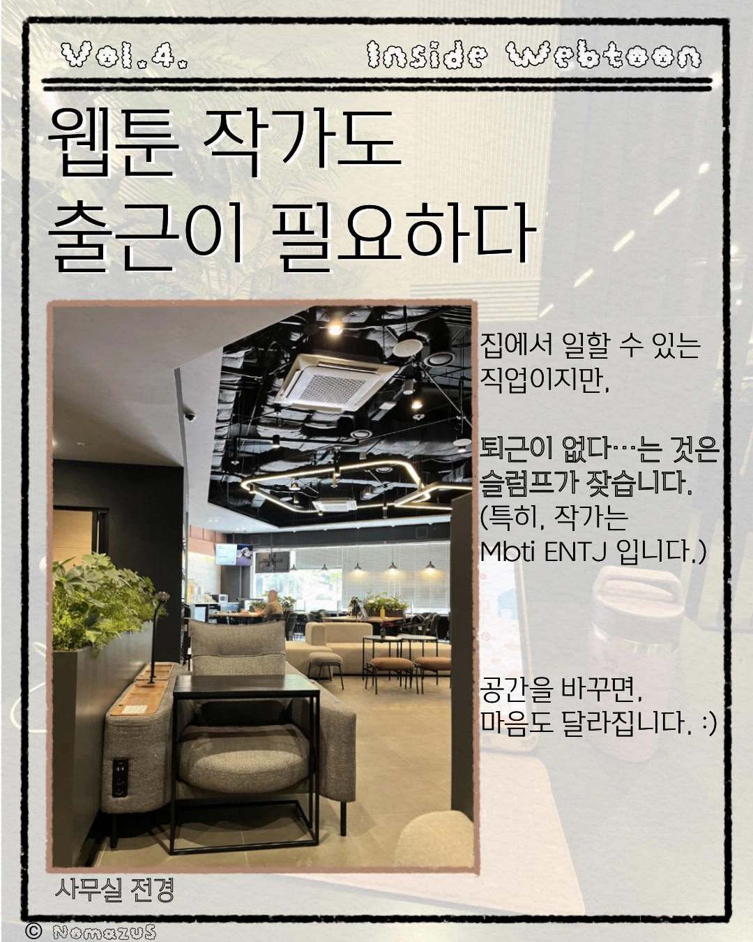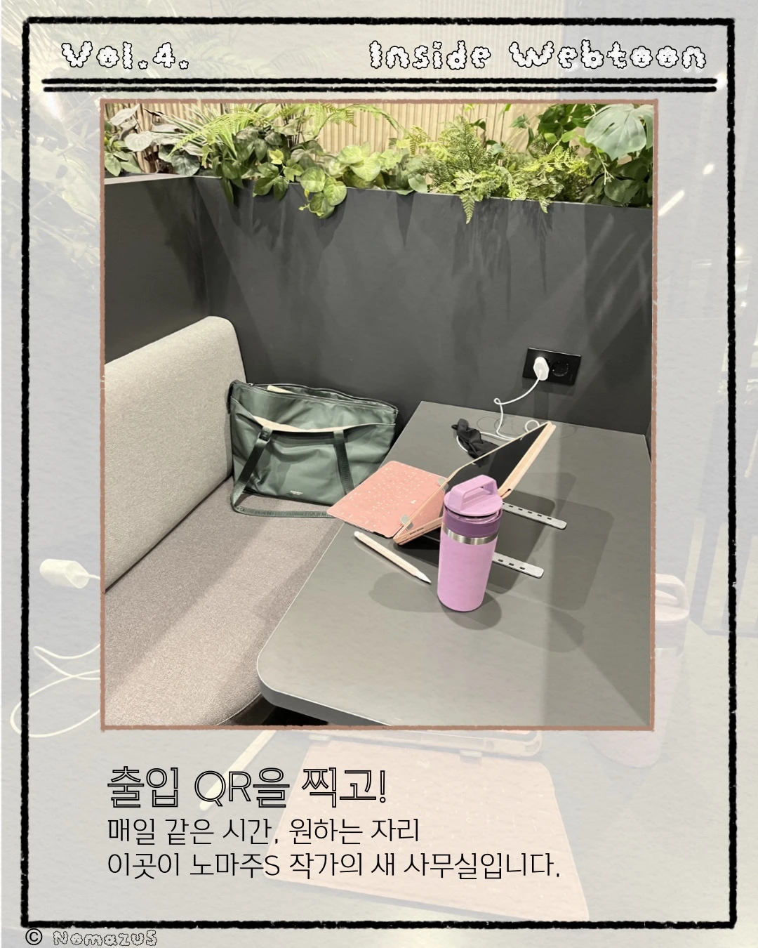 <<매거진 Inside Webtoon, 4호>>오랜만에 느껴보는 매일 출근이번 호는 노마주S 작가의 오랜만의 출근으로 들떠있는 모습들이 담겨있습니다.다음 매거진에서는,이 공간에서 어떤 작업들이 이루어지는지 보여드릴게요.기대해 주세요. :)