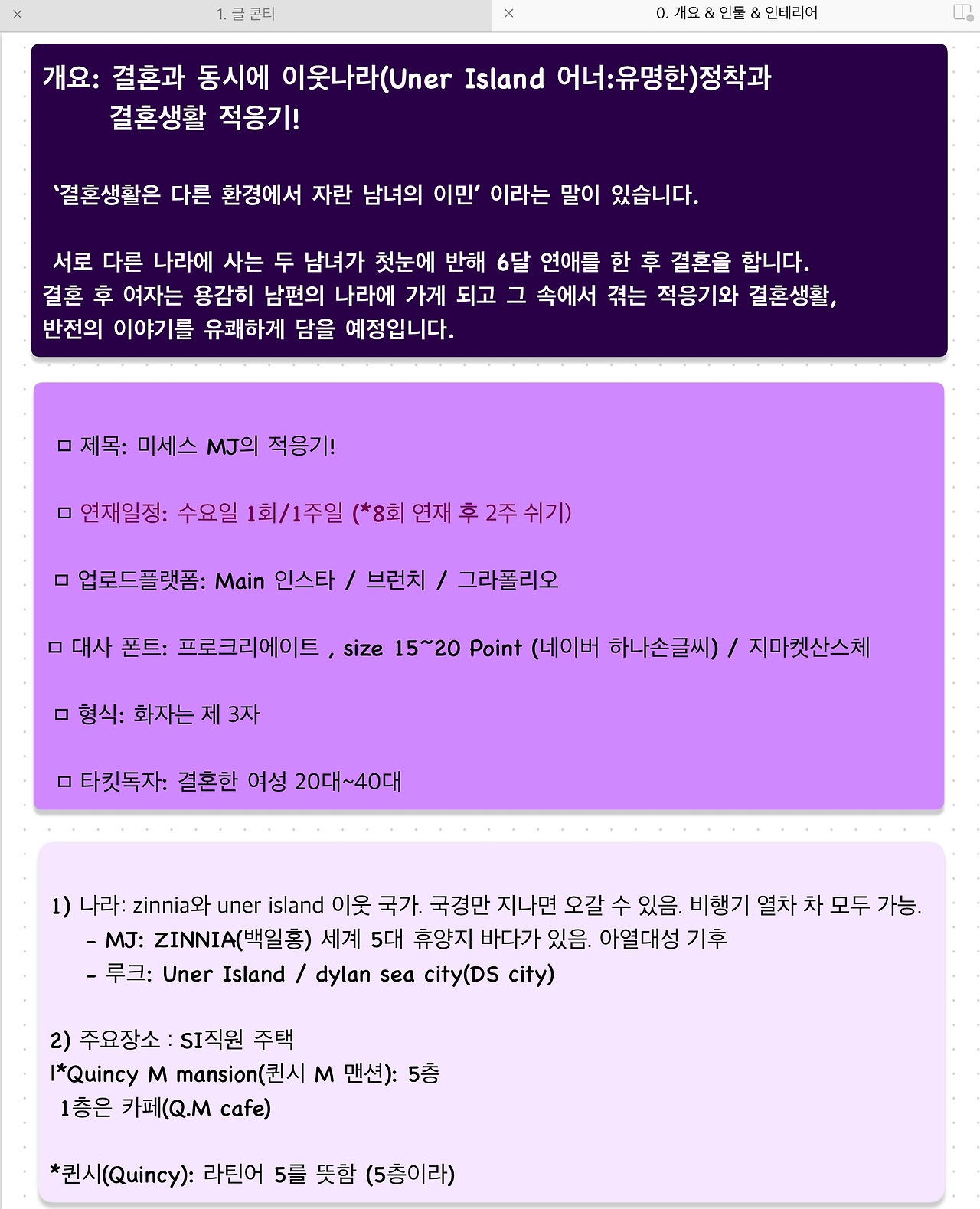 - 내용의 개요/ 제목/ 주 배경/ 연재 사항에 대한 개요 작성