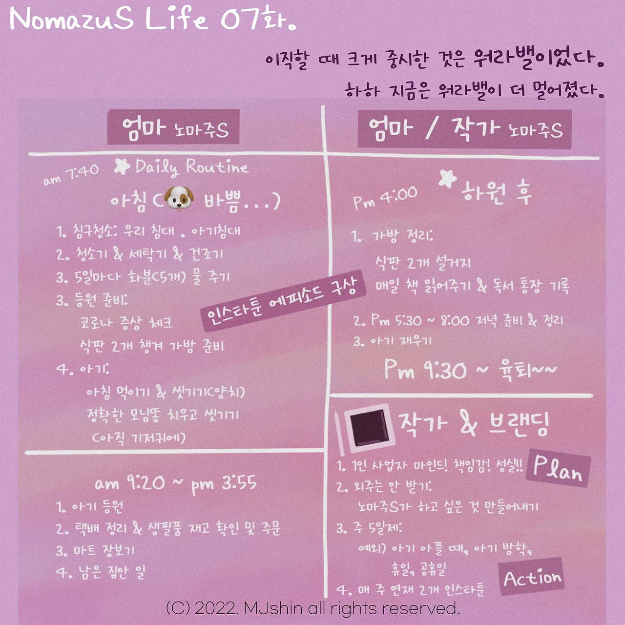 육아와 살림, 1인 기업 브랜딩 작가 이 두 가지를 모두 잘하고 싶은 마음도 큽니다. 그래서 워라밸을 중시한 마음은 사라진 지 오래되었습니다.