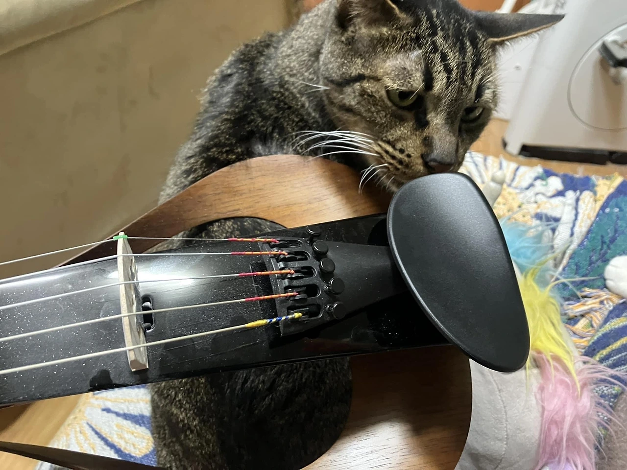 전자 바이올린을 열심히 검사 중인 고양이 1번이.