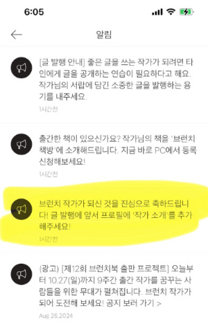 집 앞까지 쫓아가 서성이는 건 체통 떨어지는 일이라고 생각하며 브런치를 나오려는데 좌측 상단에 새 알림이 있다고 알리는 조그맣고 파란 똥글뱅이가 보인다. 클릭.