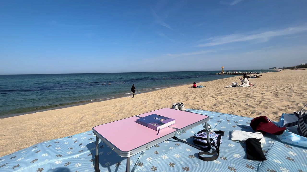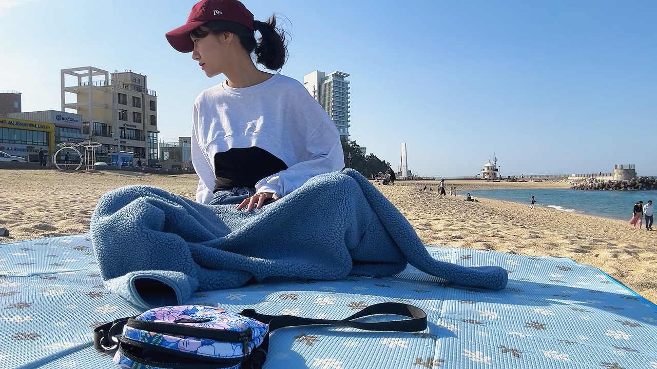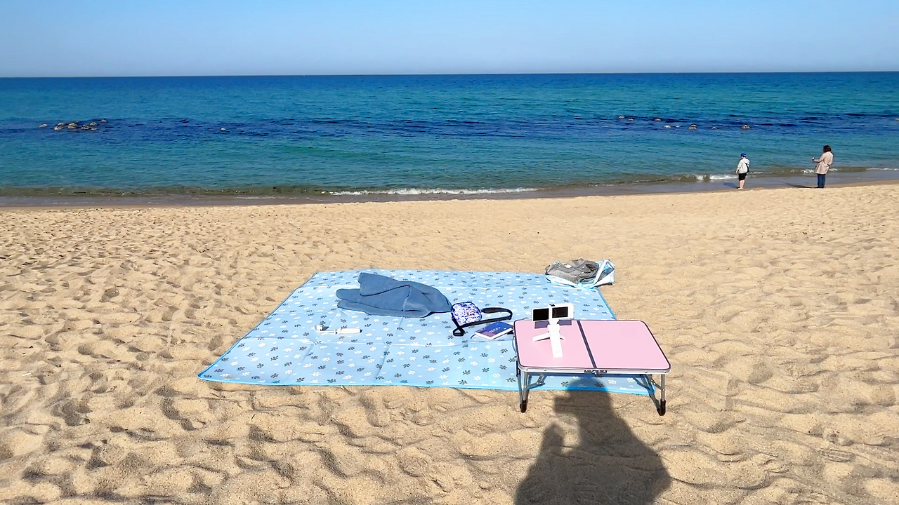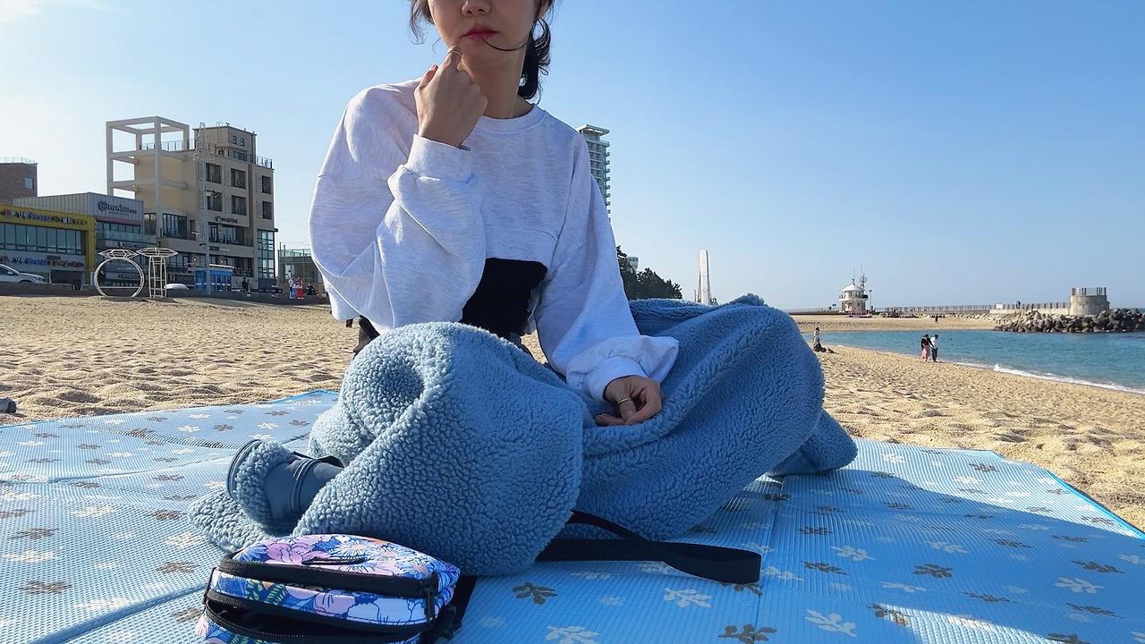 돗자리 위에 앉아 바다를 바라보다가 하늘을 향해 누워도 보고 그러다 금세 주변이 의식되어 다시 일어나 두리번거리면서도 나는 즐거웠다. 하늘과 물색을 닮은 나의 커다란 돗자리. 마침내 혼자서 피크닉을 해보았다! 해보고 싶었던 것을 이룬 순간이란 상상했던 것처럼 대단하지는 않았지만 성취감과 뿌듯함이 차올랐다.