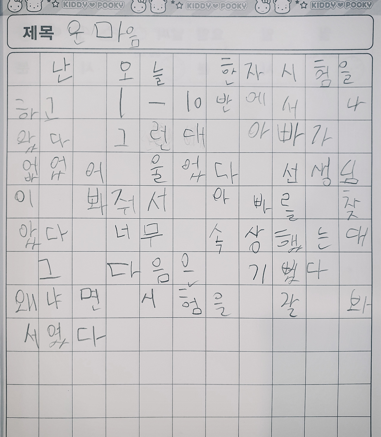 오늘은 현진이가 한자 7급 시험을 보는 날이었다. 낯선 곳에 혼자 있어본 적 없는 현진이를 위해 아빠도 바로 뒷 번호로 시험 접수를 해두었었다. 그런데 웬걸. 아빠가 현진이 뒤에서 시험을 보고 둘이 함께 손잡고 나올 거란 나의 예상과는 달리, 현진이는 1학년 맨 끝 반의 맨 끝자리로, 아빠는 2학년 맨 앞 반의 맨 앞자리로 배정이 되어버린 것이다. 아빠와 반도 다르고 심지어 층도 다르다는 얘기를 듣자마자 현진이는 울기 시작했다. 도무지 진정이 되질 않아 시험을 못 볼 수도 있겠다 싶을 정도였다. 괜찮을까 싶었지만 훌쩍거리면서도 현진이는 혼자 교실에 들어가 자리에 앉았고, 그렇게 시험은 시작되었다.