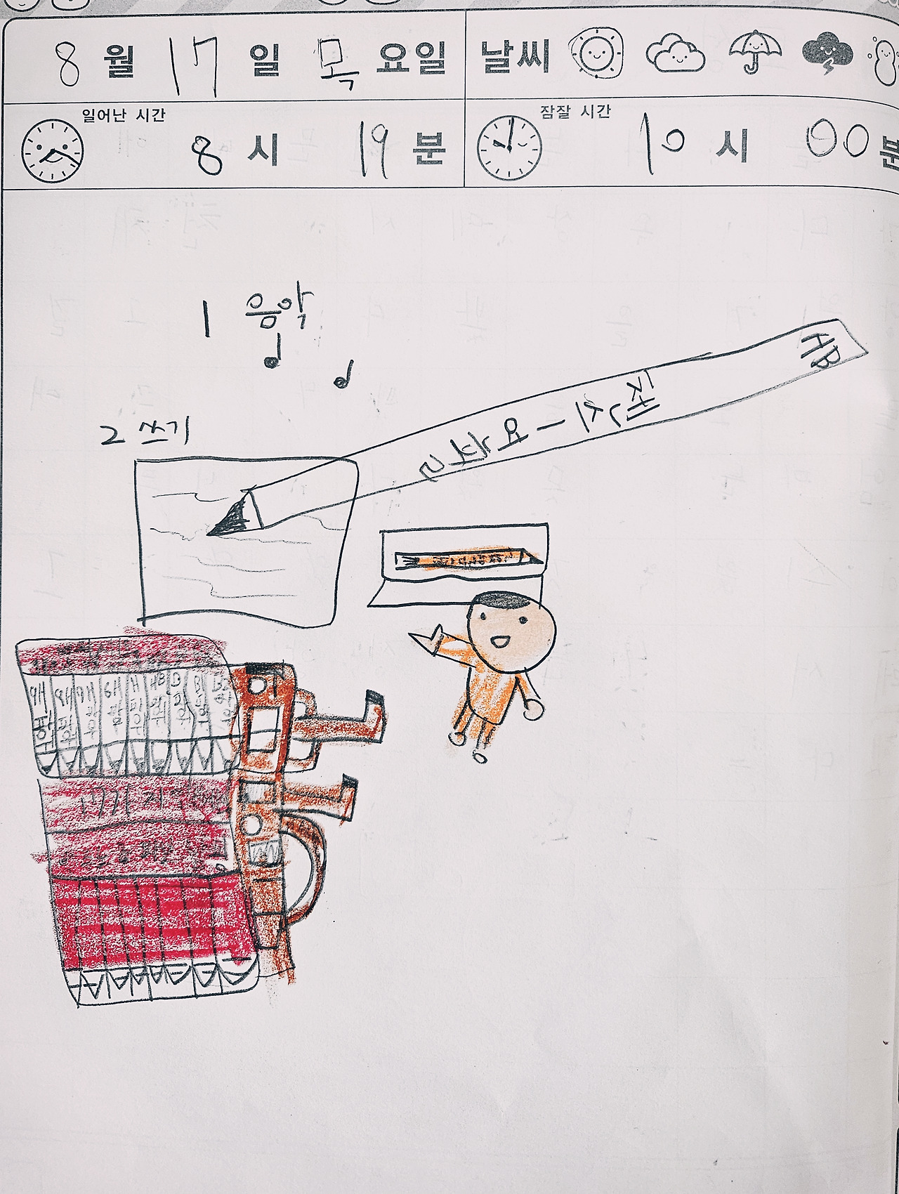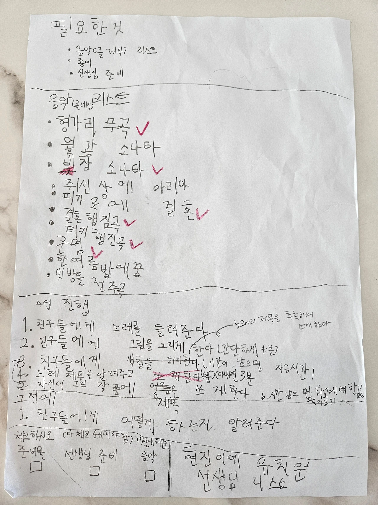 현진이의 일곱 살 시절 담임선생님께서 따로 연락을 주셔서 선생님이 현재 맡고 있는 7살 반 친구들에게 1시간 정도 수업을 하고 같이 점심까지 먹고 가면 어떻겠냐고 제안을 해주셨고, 현진이는 흔쾌히 기쁜 마음으로 그 제안을 승낙했다. 나랑 현진이랑 둘이서 방학동안 했던 창의수업 중 현진이가 가장 기억에 남는 주제로 수업을 하기로 결정했다. 클래식 음악을 듣고 생각나는 장면을 그리고 이 곡의 제목을 추측해서 지어보는 수업이었다. 우리가 함께 수업했던 열두 곡 중 일곱 살 친구들이 흥미를 가질만한 여섯 개의 곡을 추려 패드에 저장을 했고, 현진이는 수업 순서와 약간의 대본을 적어 열심히 연습했다. 물론 나는 학생 역할을 해줘야 했으므로, 짧은 며칠간 나도 열심히 말 안 듣는 학생이었다가 착한 학생이었다가 짜증을 잘 내는 학생이 되기도 하며 마치 연극하듯 내 역할을 충실히 수행했다.