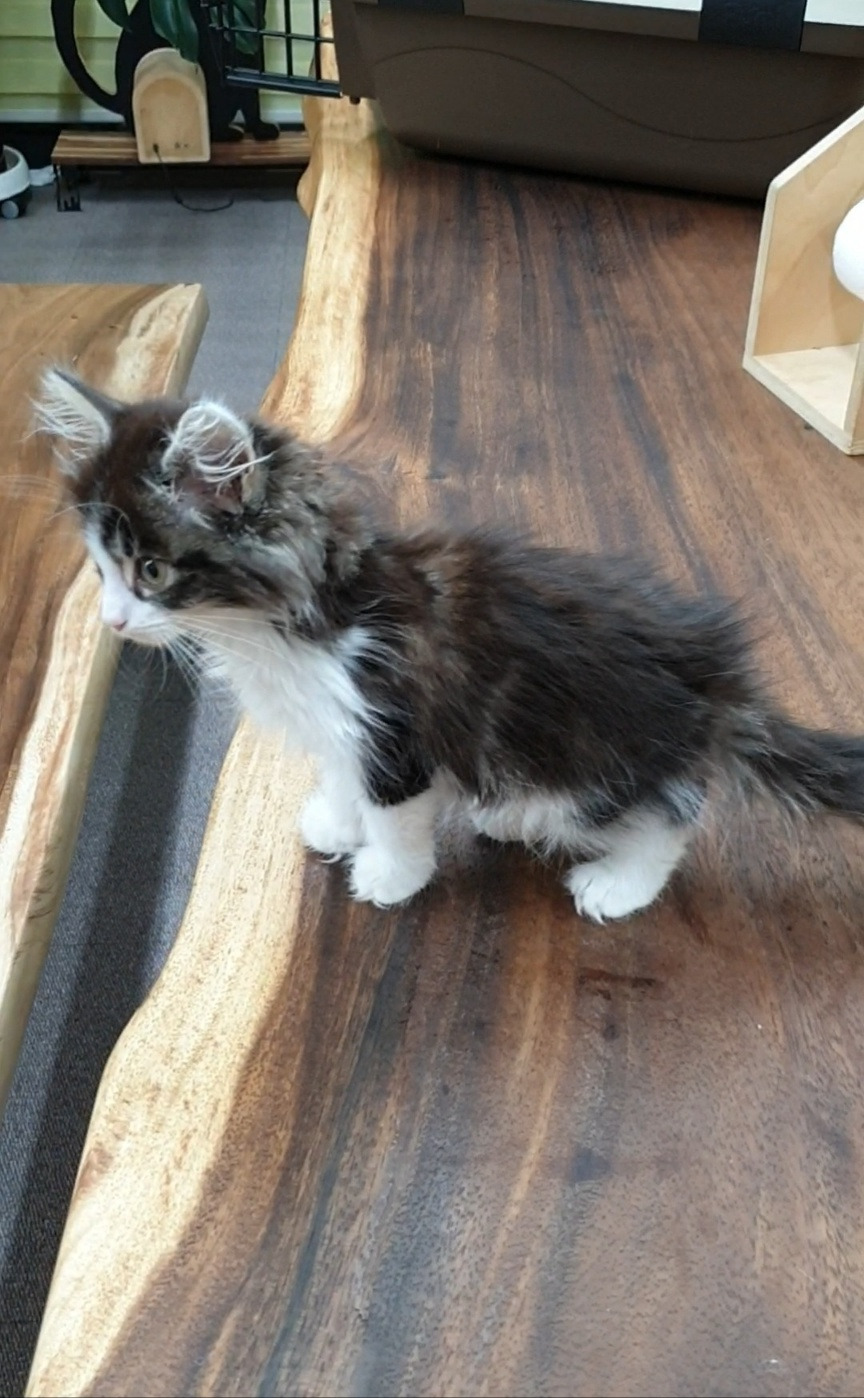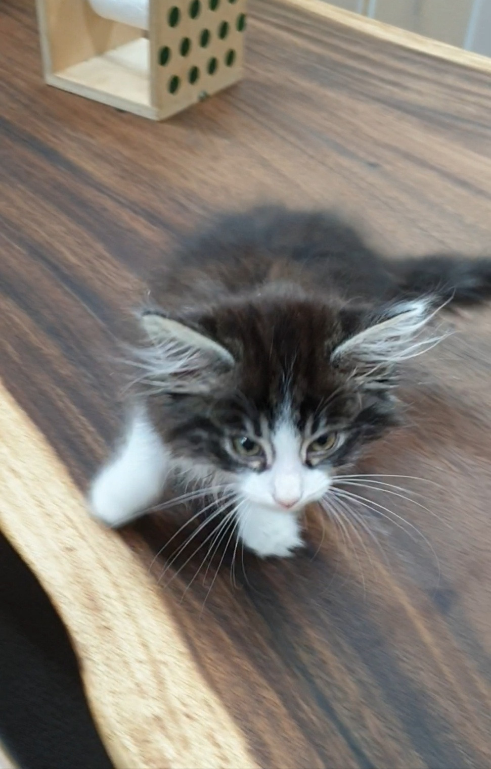 그러더니 방이 어두워지고 조용해졌다. 고개를 내밀고 좌우를 살폈더니 아무도 없는 것 같아서 살금살금 나가봤다. 일단 바닥이 따뜻해서 기분이 느긋해졌다. 익숙한 냄새를 따라가보니 여기가 화장실인 것 같아서 쉬도 한 번 했다. 옆에는 새까만 계단 같은 게 있어서 핥아봤더니 쇠 맛이다. 이동식 철제 사다리인 것 같아서 한 칸 냉큼 올라가봤다. 내려다 보니 콩이 오빠도 그새 나와서 내 발 밑을 지나 아까 그 체리목 테이블 밑으로 스윽 들어가는 게 보였다.
