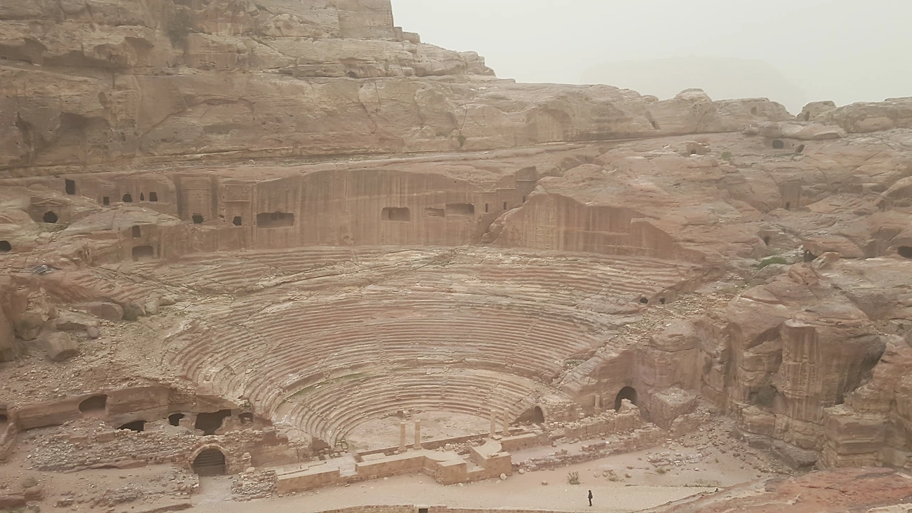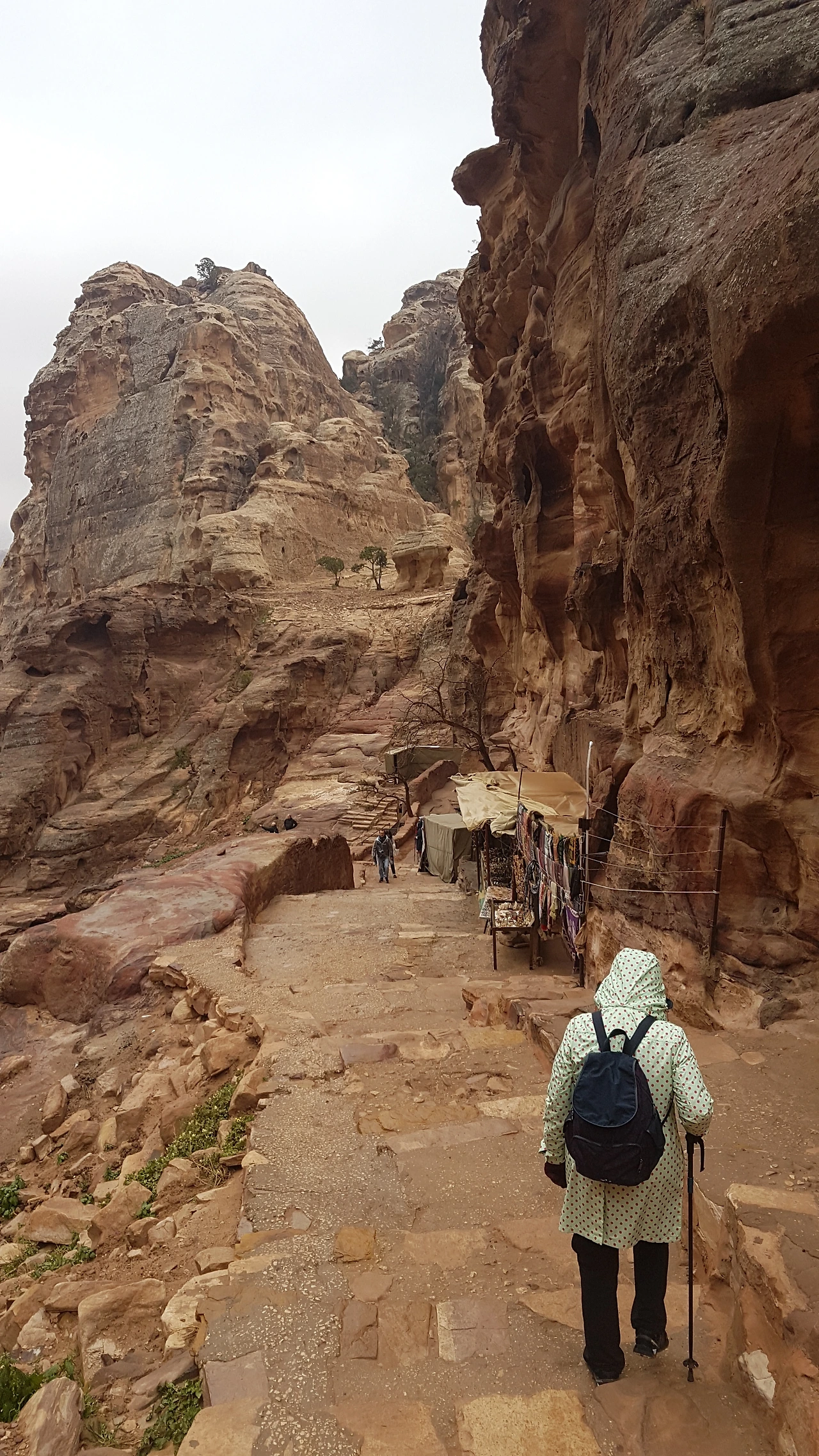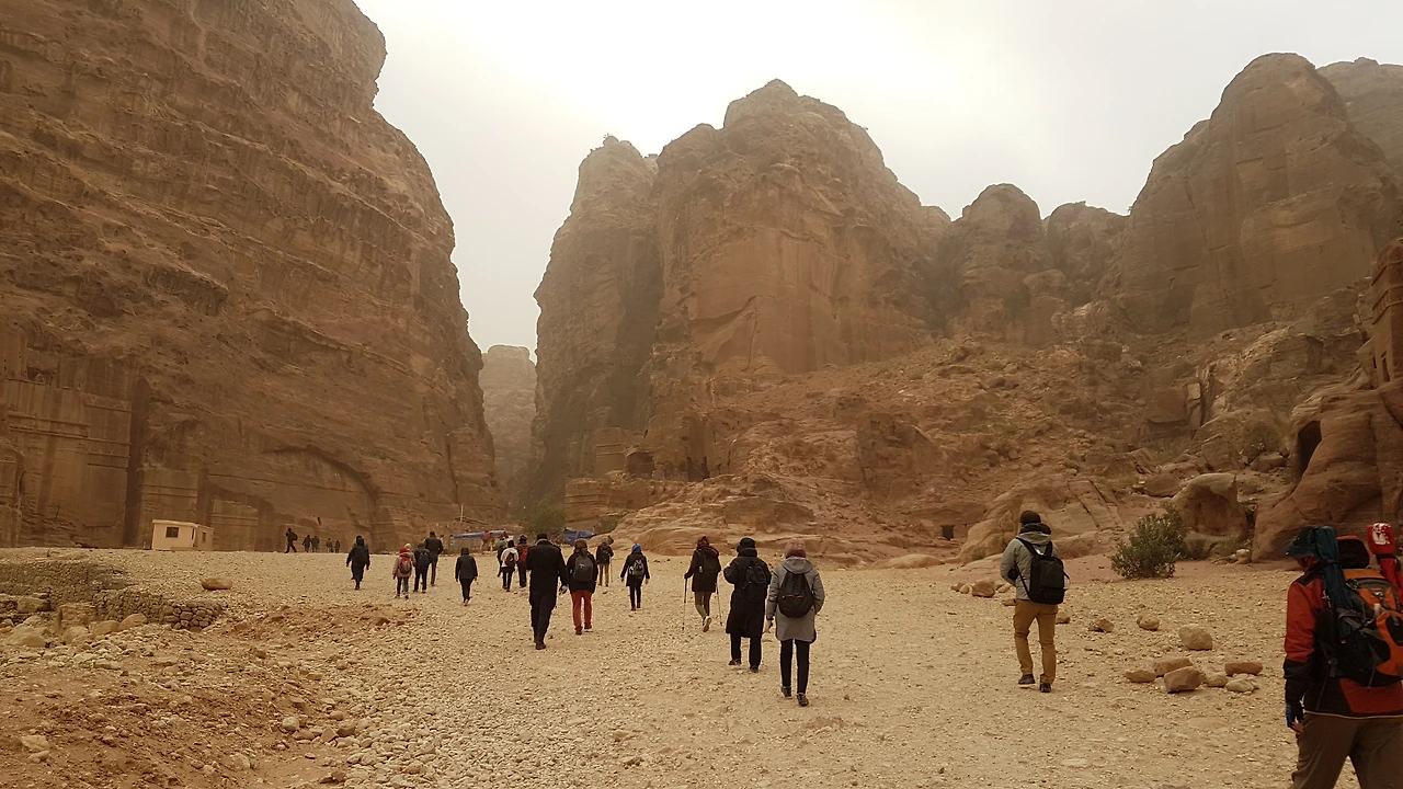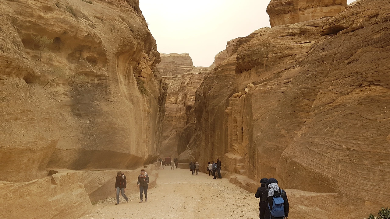 그렇게 때문에 연령대가 다소 높은 우리 손님들을 고려하여 하루에 한 트레일은 소화해내야 했다. 결전을 앞둔 심정으로 트레킹 준비를 갖추고 유적지로 향했다. 페트라 유적 초입 약 2킬로에 해당하는 시크를 지날 때는 양쪽 절벽이 바람을 막아주는 터라 걸을 만했다. 하늘은 온통 누런색이었지만 비는 오지 않으니 다행이라고 생각했다.