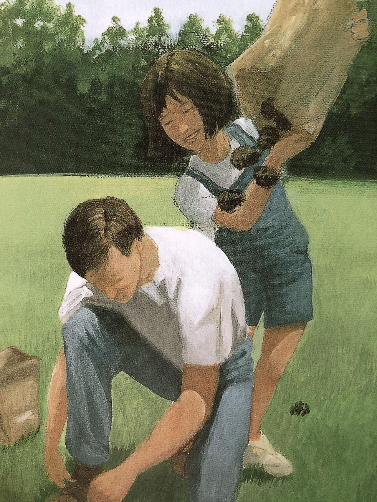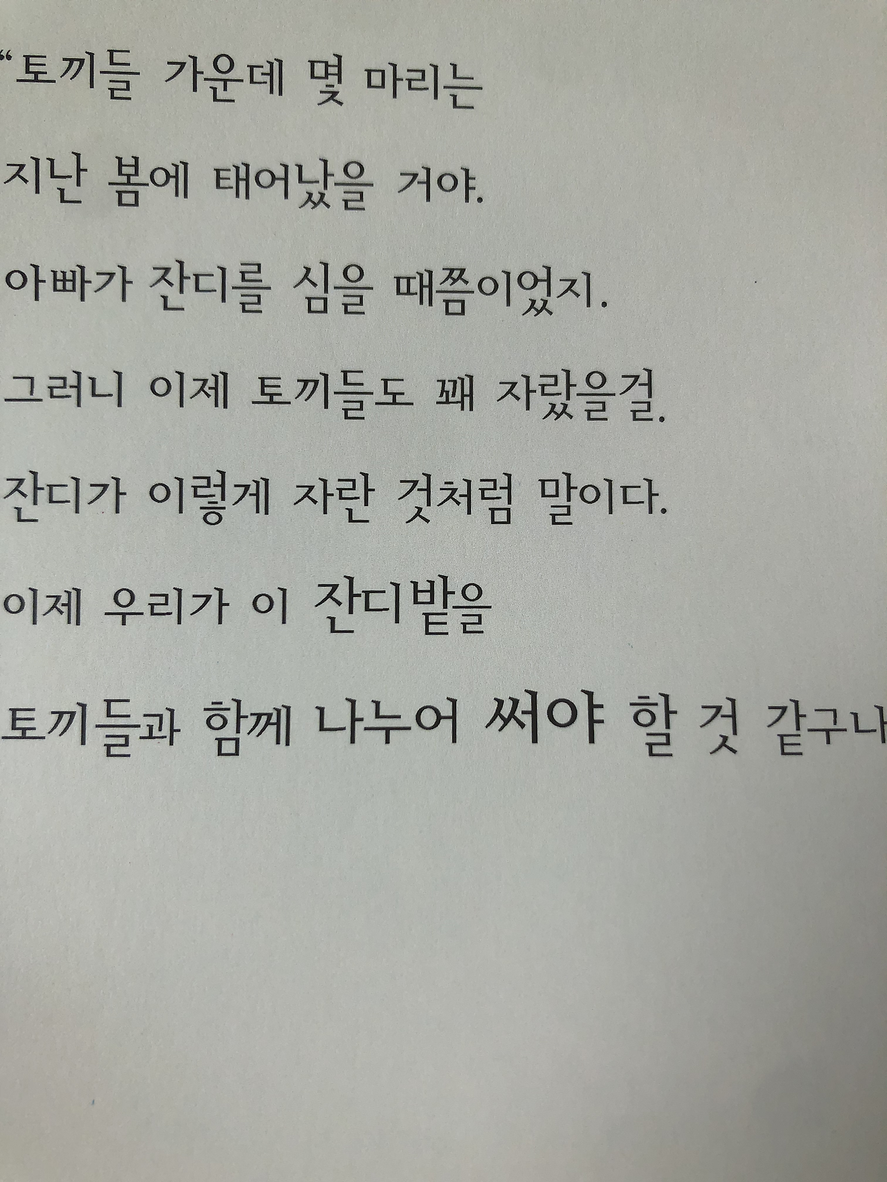 '나'는 토끼를 지키기로 했다. 그런 딸의 모습을 보던 아빠는 혼자서 열심히 잔디밭을 지키는 대신 토끼와 잔디밭을 함께 쓰겠다는 마음을 낸다. 각자의 자리를 지키고 있던 '나'와 아빠는 함께 잔디밭을 꾸미게 된다.