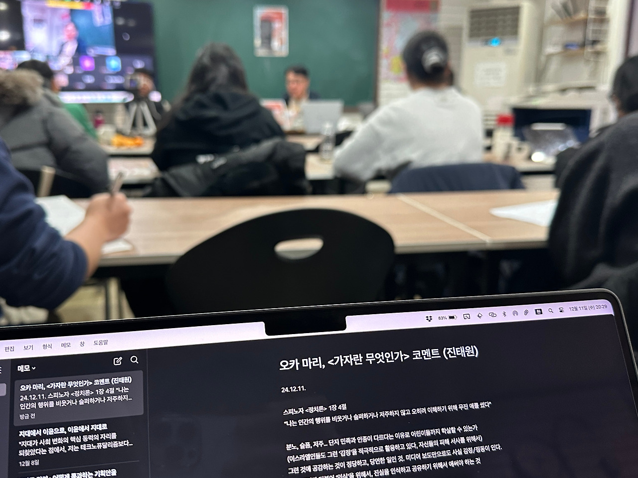 자리에 앉아 강의실을 둘러보니, 익숙한 그러나 오래도록 발길을 돌리지 않았던 과거로 되돌아간 느낌이 들었다. 강의실 벽을 가득 채운 책들, 수많은 강의 포스터, 행동을 촉구하는 표어, 변혁을 꿈꾸는 사상들을 소개하는 팸플릿으로 가득했다. 그러고 보면 장소는 어색함이 없었다. 한때 기웃거리던 어디나 비슷한 풍경이었다. (조금 넓고 조명이 밝다는 걸 제외하면 필로버스도 큰 차이는 없...) 물론 사회성이 부족한 독고다이 인생은 그렇게 기웃대다가 평범한 노동자로 살기로 결정했지만. 그렇다고 배우는 걸 멈추고 싶진 않았던 거지. 나는 언제부터 지금처럼 세계로부터 격리된 채로 살았나. 세어보다보니 강연이 시작되었다.