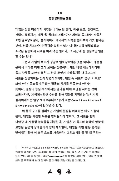10-3. 일상을 도구화하고 게임처럼 가치를 단순화하는 데 이미 익숙한 오늘날, 미적인 분투형 플레이는 우리의 일상을 게임처럼 변용하고 있는 현재의 상황에 맞설 수 있는 방책이다. 배달 앱이나 용역 앱에서 행해지는 별점 부여하기에 목을 매고, 은행 애플리케이션을 켜놓고 걸음 숫자를 늘리며 코인을 캐는 사람들이 대다수인 시대에 이렇게 단순화해도 되나? 우리가 이러한 보상에 목을 맬 가치가 있나? 라고 물어보는 태도는 매우 중요하다. 일상이 게임화되고 있다면, 우리는 미학적 분투형 플레이어로서 이에 대응할 수 있을지도 모른다. 그렇게 된다면, 이 '플레이'는 단순한 유희의 수준이 아니라, 삶의 태도의 수준으로 격상된다.