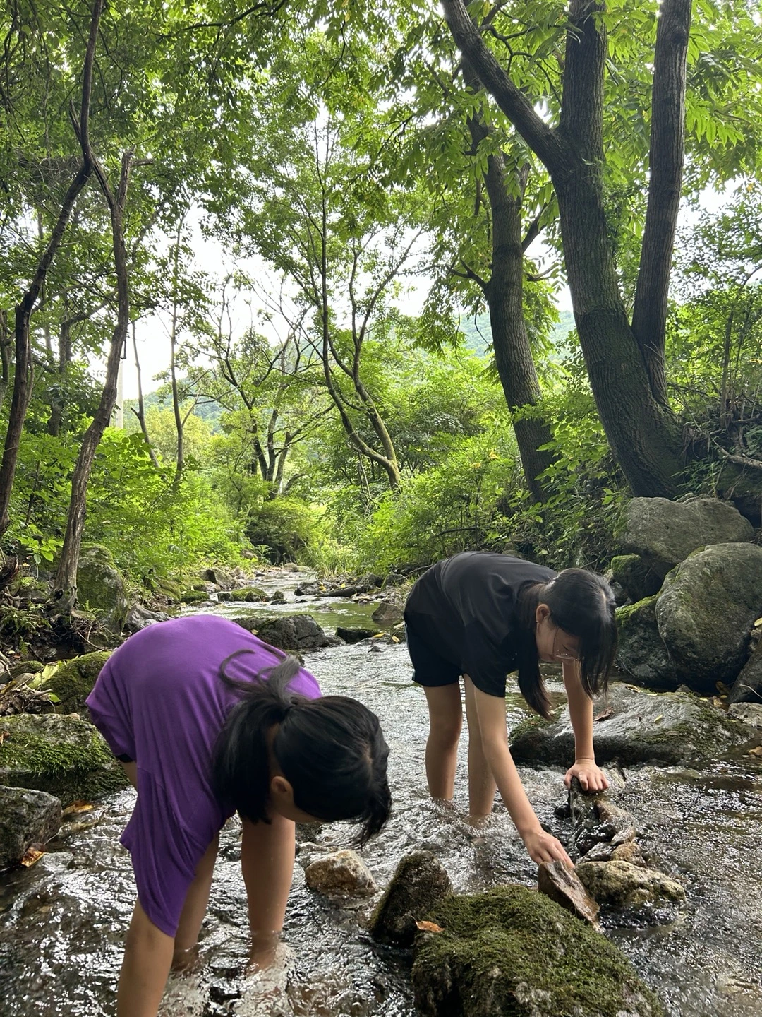 집에서 만들어 먹는 게 더워서 한 끼를 밖에서 해결하려는데 이마저 생각대로 되는 게 없다. 모두가 휴가지로 향하는 때이니 성수기엔 서비스다운 서비스를 받기도 어렵고 발 빠르게 숙소를 예약해 놓은 것도 아니니 조용한 산촌으로 길을 떠났다. 산 아래에 위치하지만 한낮의 더위를 피해 갈 수 없으니, 거실 천장에 달린 에어컨에 몸을 맡긴다. 냇가에는 장마철에 불어난 수량으로 물살이 제법 세차게 흐르는데 차갑기까지 하다. 자연에 내던져진 아이들은 어느새 돌을 모아 둑을 쌓으며 물과 함께 노닌다. 방학이지만 학원의 뺑뺑이에 자유롭지 못하고 핸드폰만 손에 쥐고 살았는데 시원스레 흐르는 냇가에서는 물 만난 고기처럼 즐거운 모양이다. 냇가에 발을 담그고 쉬는 사이 아이들은 옷을 입은 채로 물에 들어가 앉았다.