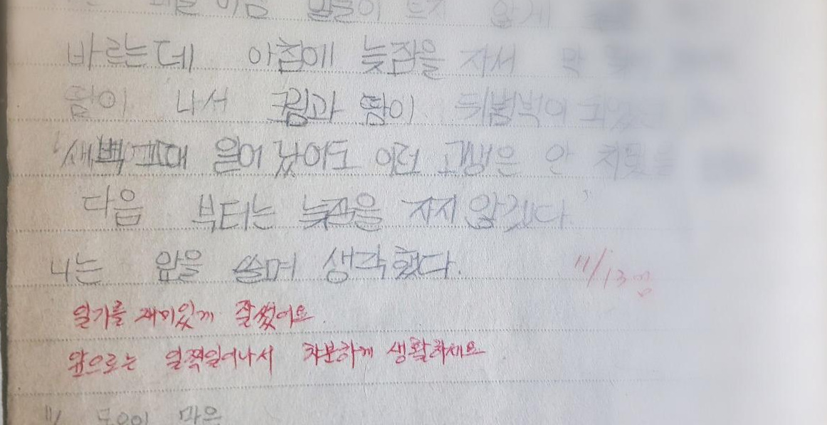 그러던 어느 날 선생님은 한참 일기를 읽고 펜으로 느낌을 달아주시다가 소리 내어 흐느껴