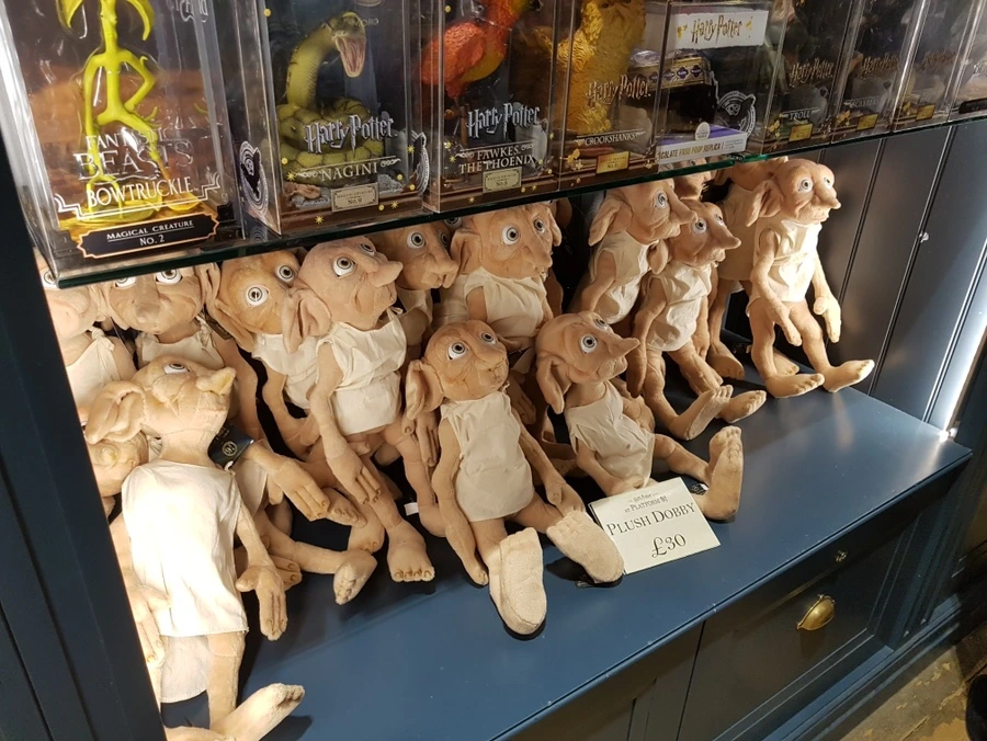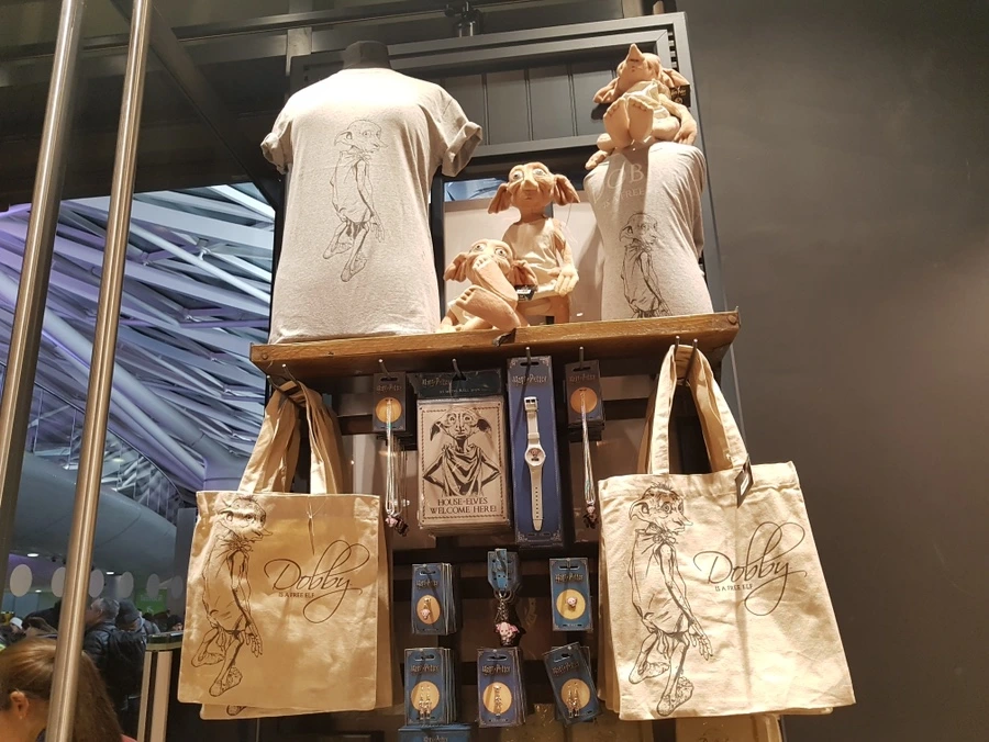 줄을 서서 차례를 기다린 뒤 카트를 밀며 벽에 박는 시늉을 하는, 학교에 가려고 고군분투하는 해리포터를 흉내 내는 기념사진을 찍는 사람들을 구경하다가, 줄을 설까 말까 잠시 고민했지만 결국 줄을 서지 않고 도비 기념품숍으로 가서 도비 인형과 도비 얼굴이 그려진 티셔츠와 가방을 구경했다.