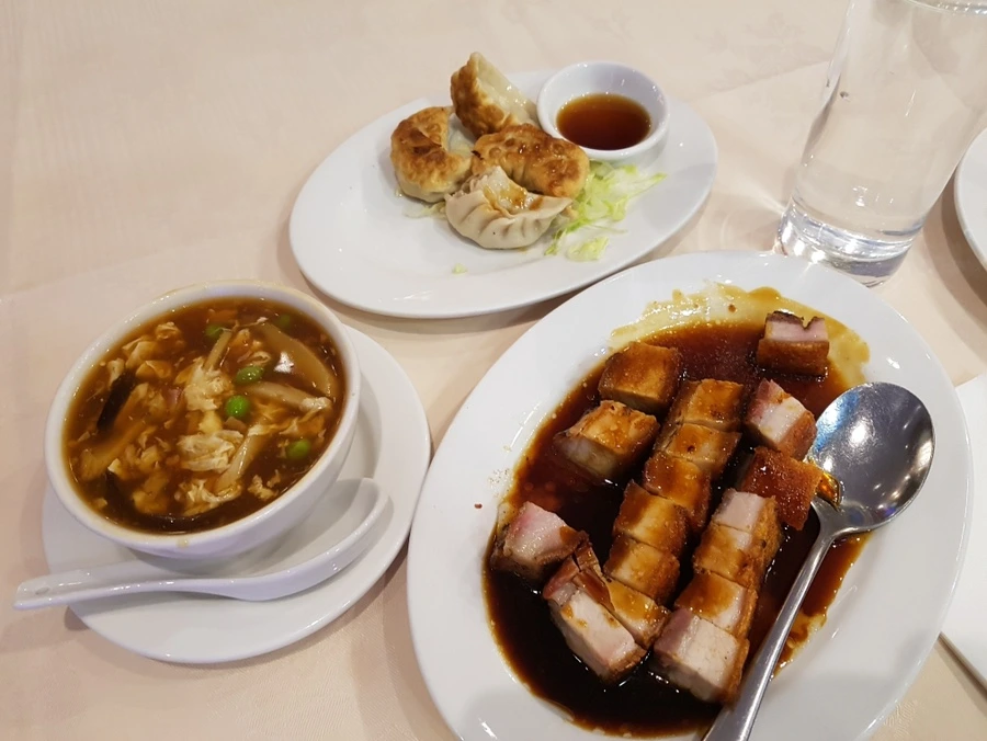 가게는 외양만 조금씩 다를 뿐 비슷한 메뉴를 파는 것 같았고, 결국 뚜렷한 선정 기준 없이 어느 이층짜리 중국요릿집에 들어가 동파육 조그만 한 접시랑 계란과 전분을 푼 걸쭉한 국물에 숙주와 버섯, 완두콩이 들어간 수프, 군만두 네 개를 시켰다. 이렇게 쓰고 보니······게 요리만큼이나 화려해 보이네.