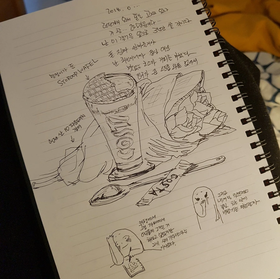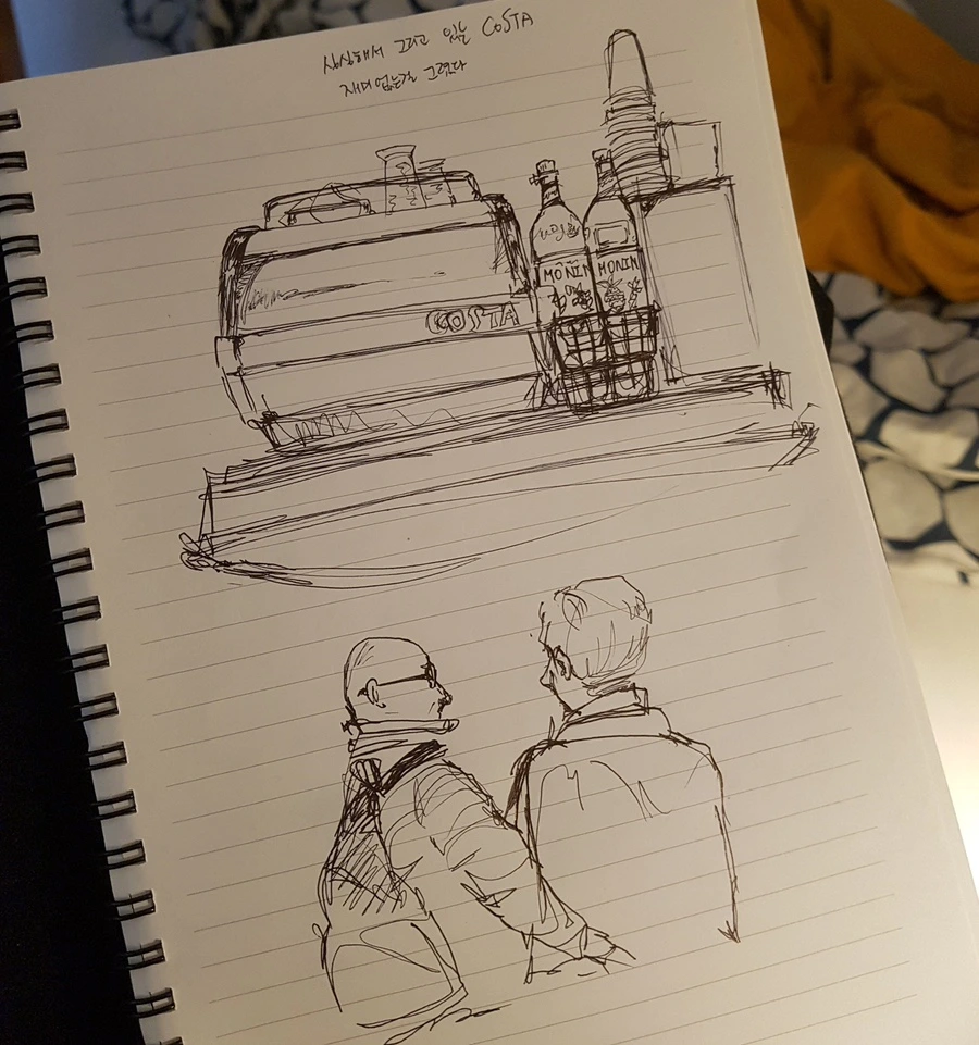시간이 좀 걸릴 거라고 해서 그가 휴대폰을 수리하러 사무실로 들어간 동안 위층으로 올라가 길거리에서 많이 보이던 카페 '코스타(costa)'로 들어가 커피 한잔을 주문하고 자리에 앉았다. 이러다 비행기를 놓치면 어쩌지. 시간 놀리기에 휴대폰 하는 것만큼 효과적인 게 없는데. 나는 전전날 만났던 M이 챙겨 준 공책과 볼펜을 꺼내 눈앞에 보이는 것들을 그렸다. 커피 머신, 머신 위에 놓인 컵들, 머신에 가려진 시럽통들, 가게에 있는 사람들······을 그리며 미리 예약해 둔 내셔널 익스프레스가 내게서 영영 떠나가고 있음을 탄식했다.