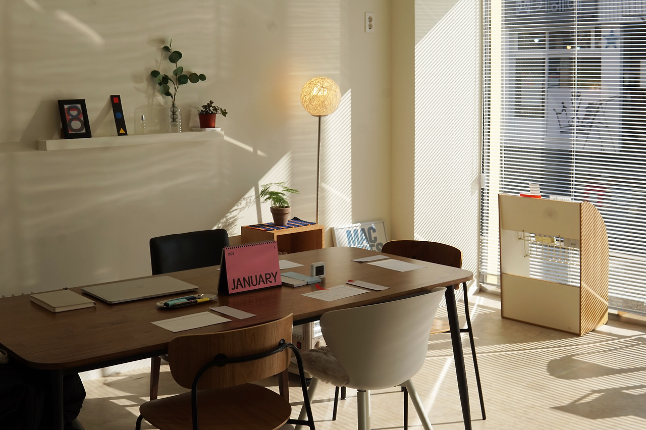 유일한 부담은 도보와 맞닿은 전면이 통유리인 1층이라는 점이었다. 이거 뚫려도 너무 뻥 뚫렸다. 지나가는 행인들의 시선이 작업실로 쏟아진다. ‘여기는 대체 뭐 하는 곳이지?’ 호기심에 사람들이 유리에 얼굴을 밀착하고 내부를 들여다본다. 남향집에 쏟아지는 햇빛을 가리기 위해 블라인드를 달았지만 가장 가리고 싶은 건 사람의 시선이었다. 사람들이 나를 보지 못하도록 일말의 틈도 용납해선 안 된다. 늘 블라인드를 바닥까지 꾹 내렸다. 차마 블라인드를 올릴 용기가 없었다. 아직 사람들의 눈을 마주할 자신이 없었다.