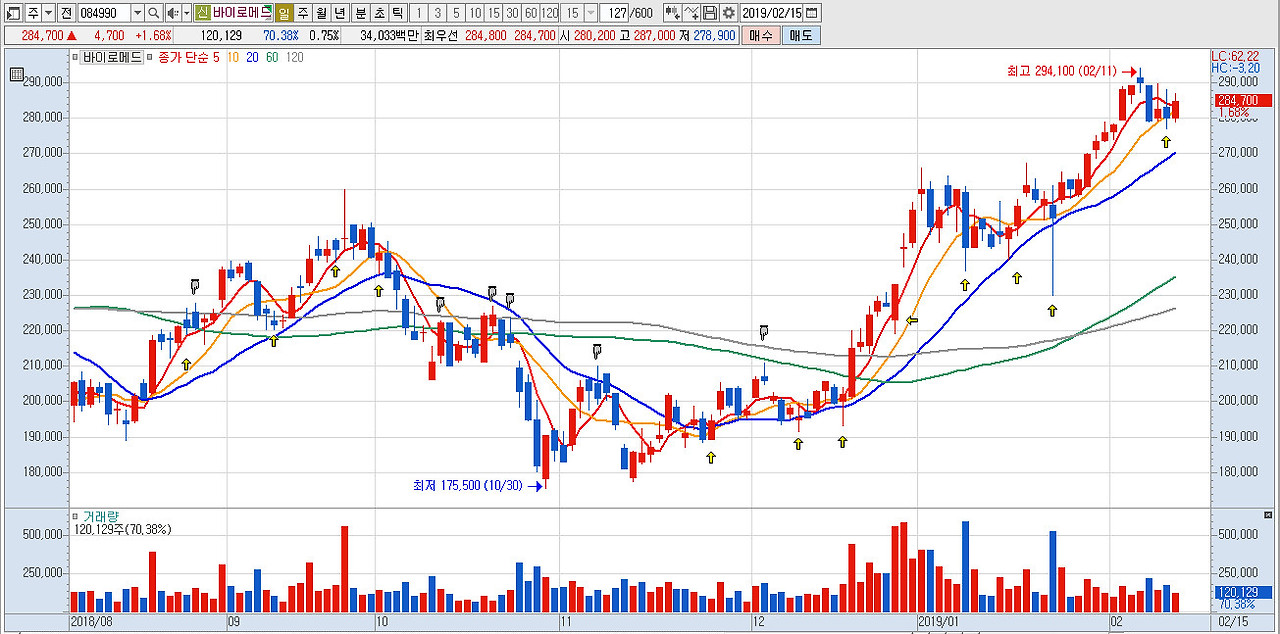 상기의 바이로메드의 최근 차트 입니다. 이동평균선을 제거 하였습니다. 어디에서 지지가 나오고 어디에서 저항이 나올지 얼핏봐서는 알 수가 없습니다. 하지만 이동평균선을 추가하면 상황은 달라집니다.