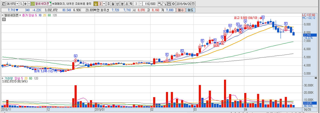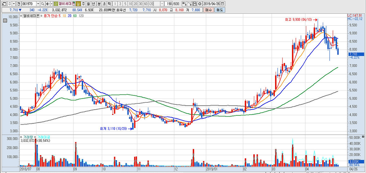 엘비세미콘은 올해 초 4,000~5,000원 정도의 가격대가 형성되었지만 4월 방탄소년단의 컴백과 더불어 주가가 9,900원까지 약 100%가량 상승하였습니다. 100%가량 상승이라니, 정말 놀랍지 않습니까?