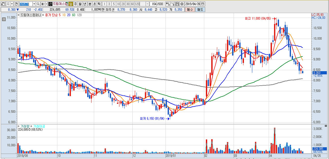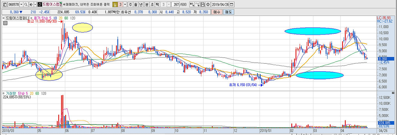 드림어스 컴퍼니의 1년 전의 모습을 보면 저점 대비 약 60%가량 상승하였습니다. 하지만 올해 초 2월부터 작년 5월의 상승분 해당만큼의 상승을 진행하였음에도 불구하고 거래대금은 그에 준하지 않아 이 것이 과연 진정한 상승일까라는 의구심만 낳을 뿐입니다.