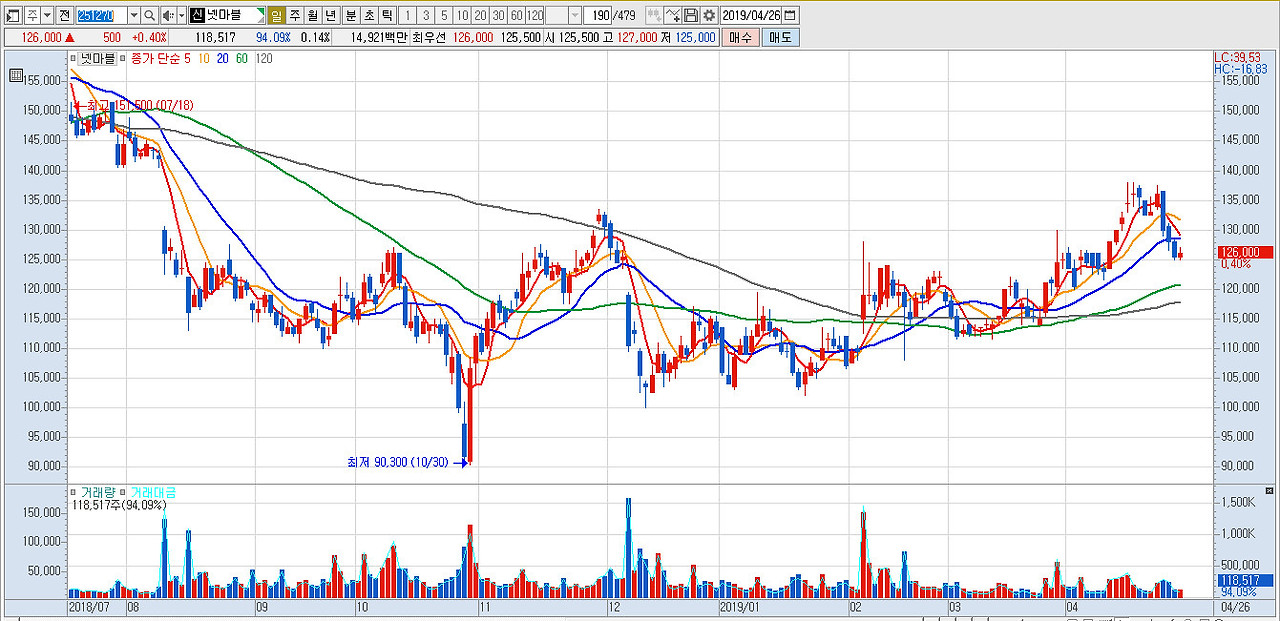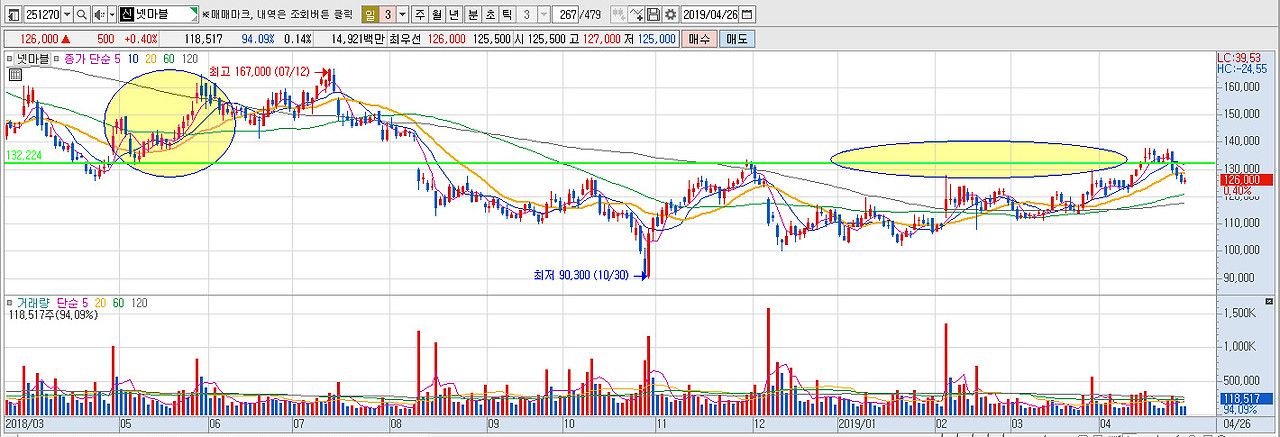 넷마블 1년가량의 일봉입니다. 왼쪽 노란색 원의 상승 부분의 힘이 약합니다. 충분한 상승이 나오지 않았습니다. 동시에 올해 초부터 상승한다 하더라도 작년 5월 방탄소년단 상승하였을 때의 저점 부근 근처에서 상승에 대한 추진력을 얻지 못하고 주가가 하락하기 일 수에 주가 변동폭도 작습니다. 상승 시그널 또한 약합니다. 모르긴 몰라도 이 종목을 매수하면 큰 상승을 기대하기 힘들 것 같다는 느낌이 불현듯이 듭니다.