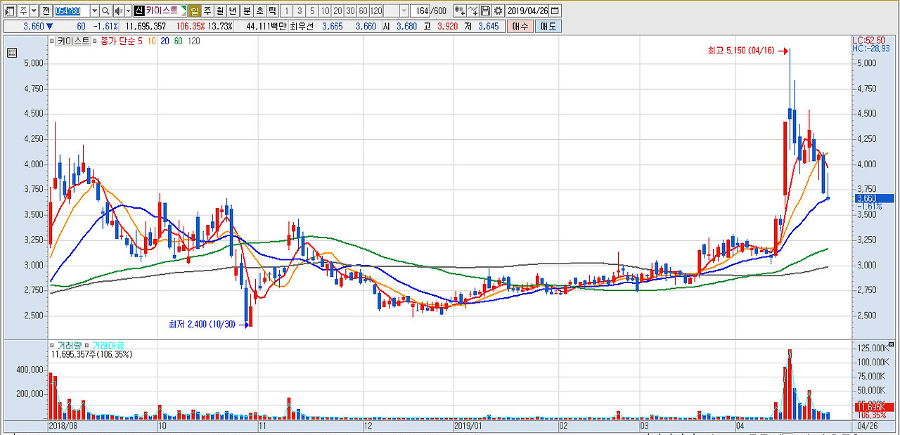 얼핏 보면 드림어스 컴퍼니(구 아이리버)도 연초 대비하여 큰 상승을 준 것 같지만 자세히 보면 2월의 상승 이후 큰 상승보다는 등락이 큰 횡보와 일시적인 상승만 하다가 오히려 더욱 하락하였다고 할 수 있습니다.