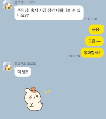 “나 지금 우리 팀 후배랑 통화를 좀 해야 할 것 같아. 내가 나중에 전화할게. 응 그래그래 안녕”