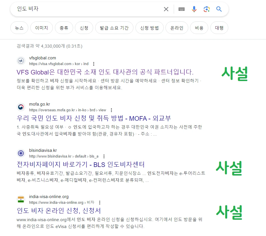 요즘 인도 비자를 터무니 없이 비싼 가격에 신청했다는 사람들이 늘어났다. 그래서 왜 그런지 검색해보니, 대행인데 대행이 아닌 공식 업체 및 기관인 것처럼 교묘하게 장사를 하는 업체들이 검색어/키워드를 먹고 있기 때문이었다. 위의 사진은 구글에서 '인도 비자'를 치면 나오는 목록인데, 사진 첨부에도 적어두었지만 외교부의 공지를 제외하면 한 면이 전부 사설업체다. 하지만 이들은 모두 '대사관의 공식 파트너' 혹은 '인도 비자센터' 등으로 마치 인도 외교부와 다이렉트로 연결되어 있는 것과 같은 모습을 보이고 있었다. 검색해서 바로 나오고, 또 전부 한글로 번역되어 나오니 신청은 편하고 쉽다. 하지만 아래 링크를 제외한 모든 홈페이지는 전부 사설임을 명심해두시길 바란다.