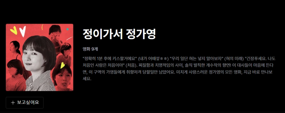 <내가 어때섷ㅎㅎ>과 비슷한 결의 단편이자, 정가영 감독의 정수를 보여주는 여러 편의 단편들이 현재 왓챠에 8편 정도 더 올라와있다. 평소 정가영 감독을 좋아하거나, 혹은 <연애 빠진 로맨스>를 통해 정가영 감독의 팬이 된 사람들을 위한 컬렉션이니 참고하면 좋겠다.