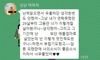 내 딴에는 큰 맘먹고 5년간 꽁꽁 숨겨온 비밀을 털어놓은 후 아주 속 시원해질 생각이었는데 대수롭지 않아 하는 친구들 반응 때문에 좀 뻘쭘해졌다. 그리고 고마웠다. 호들갑 떨지 않아 줘서. 친구들이 보낸 축하 카톡을 모두 저장해뒀다. 생일 축하가 아닌 축하는 실로 오랜만이었다. 나는 살아가는 동안 여전히 부끄럽고 숨기고 싶은 게 생기겠지만 그때마다 오늘을 떠올리며 용기를 얻을 것이다. 대학 시절 가장 친한 친구 중 하나였지만, 두 아이의 엄마가 되고 서로의 삶이 달라지면서 조금 멀어졌다고 생각한 친구가 있다. 책이 나왔다는 이야기도 직접 전하지 못했는데 다른 친구에게 듣고선 바로 전자책으로 주문해서 읽고 축하한다고 연락을 해왔다. 너무 우울한 내용이라 친구들에게 보이고 싶지 않았다는 말에 이런 답을 해준다.