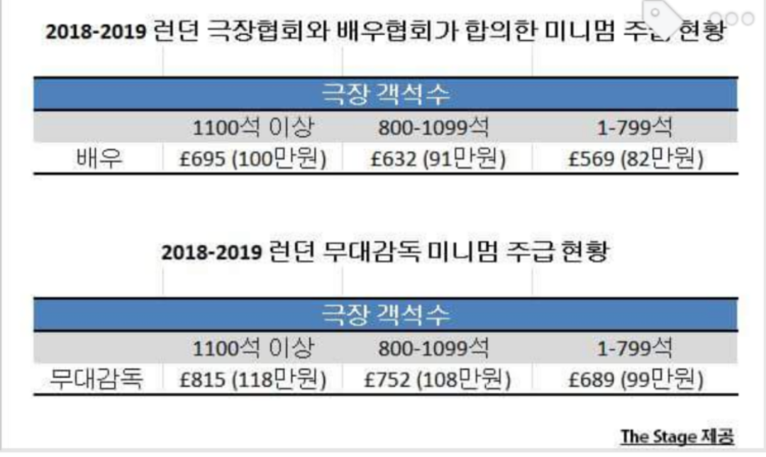 과연 우리나라의 공연 업계만 이런 건지 문득 궁금해져 자료를 찾아보았다. 그렇게 찾은 자료는 아래와 같다. 아래는 뮤지컬의 고장과도 같은 런던과 뉴욕의 미니멈 주급 현황이다.