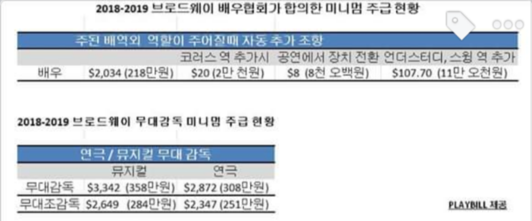 미국의 브로드웨이의 경우, 배우 노동조합이 있기 때문에 가입된 사람들은 최저 페이를 보장받을 수 있다고 한다. 최저 시급이 보장될 뿐만 아니라 브로드웨이의 경우 어떤 경우에 얼마를 더 지급받을 수 있는지까지 명확하게 정리되어 있었다. 예를 들면 공연 내에서 무대 장치 전환 한 번 할 때마다 추가되는 금액, 스윙이나 언더스터디의 경우 추가되는 금액이 표로 상세히 나와있다.