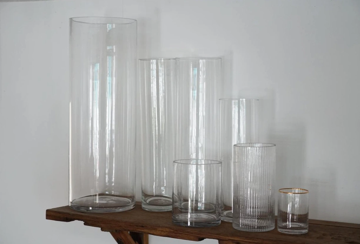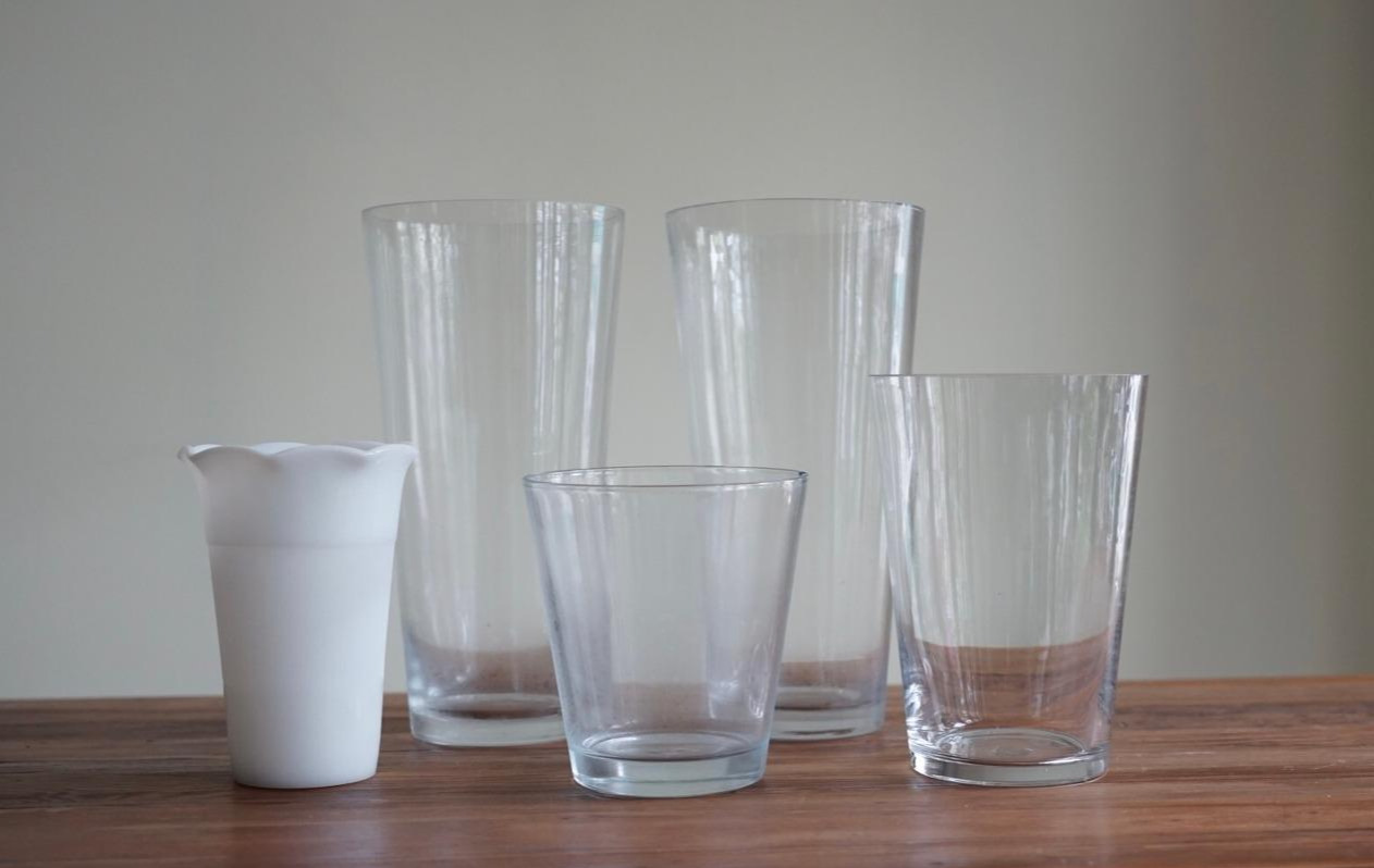 마음먹고 찾아보면 집 안 어딘가에서 유리 화병 한 두 개씩을 발견하게 됩니다. 가족 중 누군가가 사두었거나, 기억은 잘 나지 않지만 꽃 선물로 받은 일이 있었을 수도 있습니다. 특히 원통형 화병을 갖고 있는 경우가 많습니다. 적은 양의 꽃을 꽂을 때는 화병 입구의 지름이 작은 것 즉, 좁은 화병이 좋아요. 높이가 다른 것으로 1-2개 정도 가지고 있으면 활용도가 높습니다. 높이가 30cm 이상 되는 높은 화병은 길고 가는 가지나 카라, 거베라처럼 라인이 길고 멋진 꽃을 꽂기에 적당합니다.