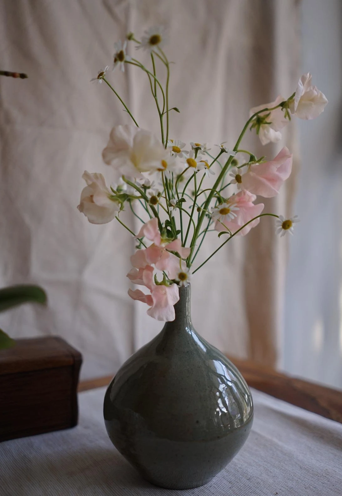 화병 입구가 호리병처럼 좁은 디자인으로 목에서 잡아주는 화병에 속합니다. 꽃 한, 두 대를 꽂아 두기에 적당해서 화병이 하나도 없을 때 처음 갖는 화병으로 좋아요. 일상에서는 빈 와인 병이나 화장품 병 등을 찾아볼 수 있겠네요.