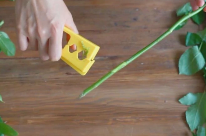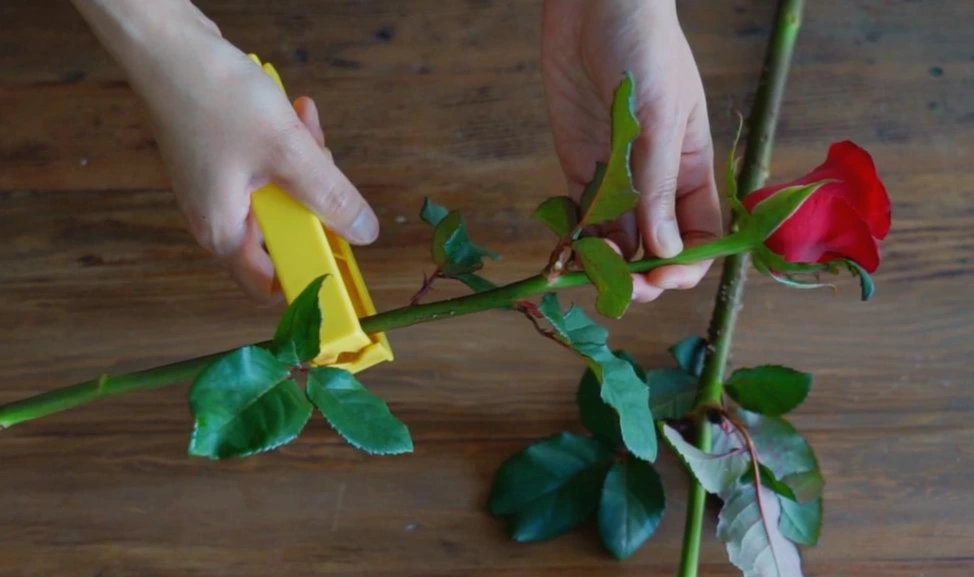 장미 가시는 가시 제거기를 사용해 제거하고, 가시 제거기가 없으면 손으로 떼거나 가위로 잘라 주세요. 줄기가 꺾이거나 상했으면 그 부분 위로 줄기를 잘라 주세요.