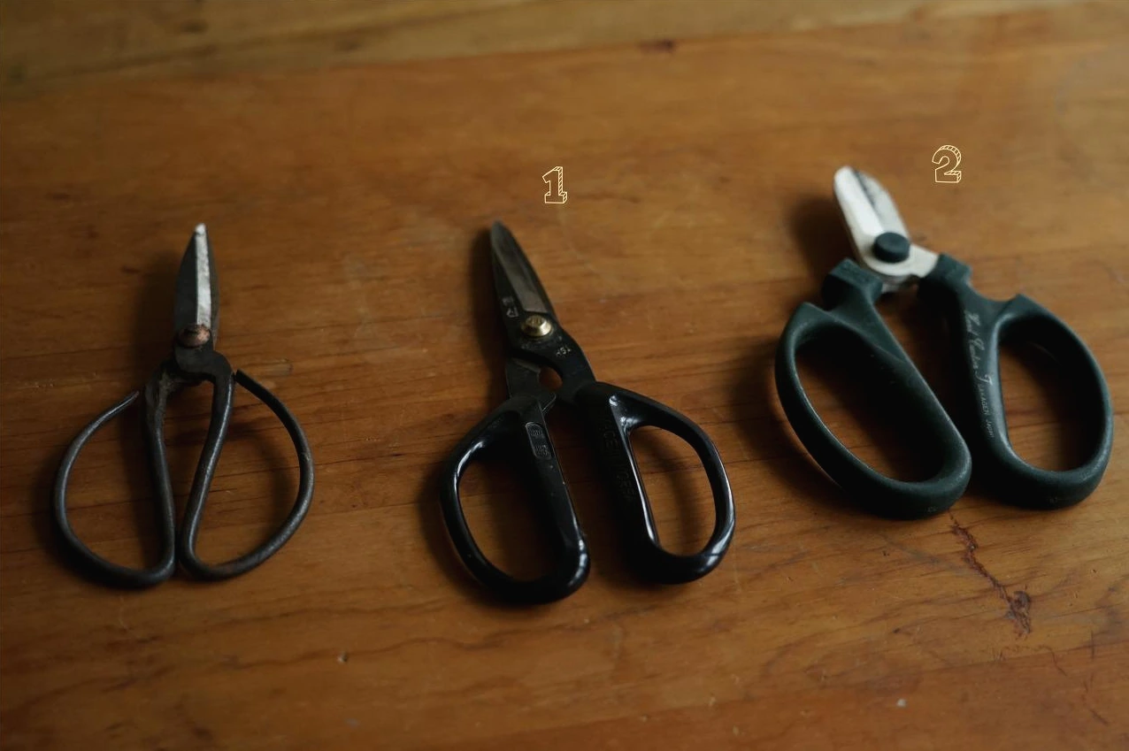 입문용으로 1번 가위를 추천합니다. 1번 가위는 인터넷이나 꽃집에서 저렴한 가격에 쉽게 구입할 수 있습니다. 굵은 나뭇가지를 제외하고 거의 모든 생화를 자를 수 있습니다. 가위 끝이 뾰족해서 잔가지를 자르거나 섬세하게 줄기를 정리해야 할 때에도 유용하게 쓰입니다. 날 표면에 코팅이 되어 있지 않아 쉽게 녹슨다는 단점이 있기 때문에 사용 후 잘 닦아서 즉시 말려주세요. 미싱 유 같은 기름을 발라 관리해 주시면 더 좋습니다. 가격이 조금 비싸도 좋은 도구를 사용하고 싶다면 3번 가위처럼 코팅이 잘 된 가위로 대체해도 좋아요.