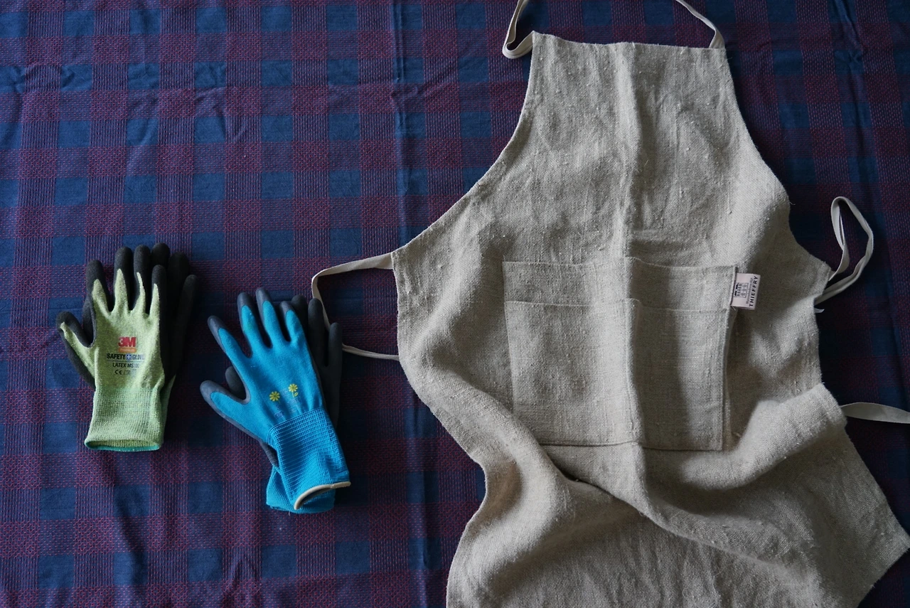 손에 밀착되는 원예용 장갑을 착용해서 도구나 꽃줄기에서 나오는 진액으로부터 손을 보호하세요. 원예 전문 장갑이 아니더라도 근처 마트나 철물점에서 손바닥 부분이 코팅된 장갑을 쉽게 구할 수 있습니다. 너무 저가의 제품을 사용하면 오히려 손을 상하게 하니 가든 용품 전문 브랜드나 잘 알려진 브랜드 제품을 사용하는 것을 추천합니다. 옷에 꽃 물이 들면 잘 지워지지 않을 수 있으니 가슴까지 덮는 앞치마를 사용하는 것이 유리합니다. 도구나 휴대폰을 넣을 수 있는 주머니가 있으면 더욱 편리하겠죠.