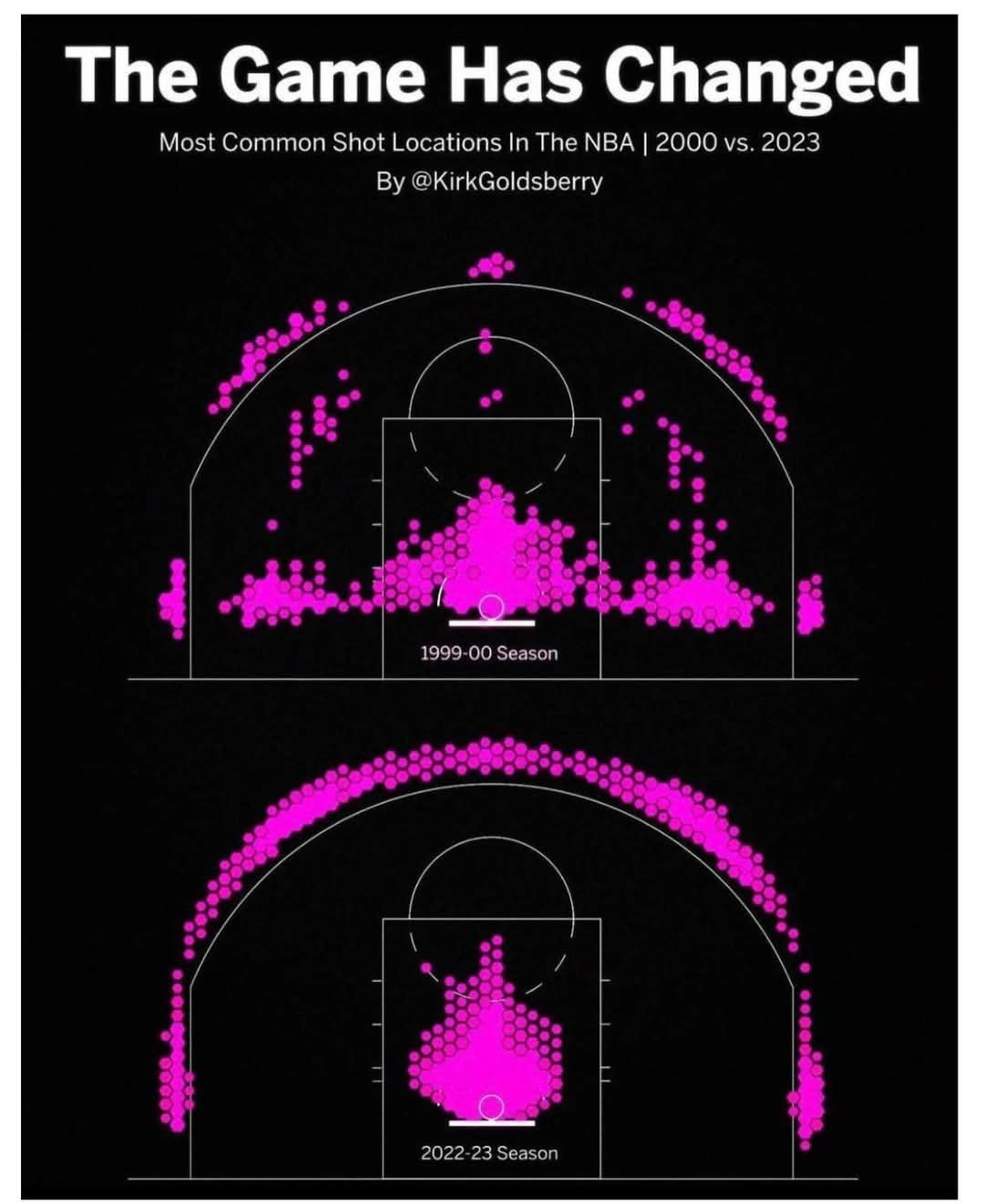 이처럼 커리의 높은 EPM은 그에게 수비수들이 집중되어 공간이 창출되고, 팀 동료들의 득점 기회가 늘어나는 ‘커리 그래비티(Curry Gravity)’ 현상을 수치화한 결과로 해석할 수 있습니다. 커리 한 명으로 인해 팀 전체의 공격 기회와 효율성이 기하급수적으로 증가하는 현상(그림 참조)을 데이터로 정확하게 포착해 낸 것입니다.