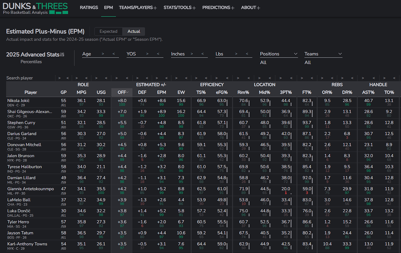 상대적으로 작은 키(190cm)와 약한 피지컬을 가지고 있지만 르브론 제임스, 케빈 듀란트, 루카 돈치치, 조엘 엠비드 등 최고의 선수들과 EPM을 비교해 보면 동등하거나 높습니다. 한국 나이로 38세가 되었지만 올 시즌에도 공격 생산성은 리그 3위에 랭크되어 있군요. 괜히 커친놈 소릴 듣는 게 아닙니다.