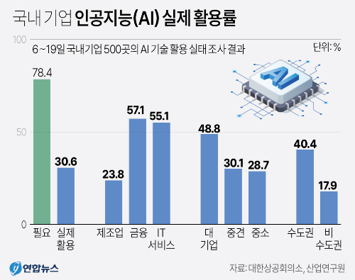 기업의 규모별 활용률을 볼까요. 대기업이 48.8%, 중견기업이 30.1%, 중소기업이 28.7% 로 기업규모에 비례해 AI 활용률이 높게 나타납니다. 지역별로는 수도권 기업이 40.4%, 비수도권 기업이 17.9%로 2배 이상의 차이를 나타냈죠. 이는 AI 활용이 사실상 자본력과 인재 확보가 용이한 수도권 위주의 대기업과 산업에 국한되고 있음을 보여줍니다.