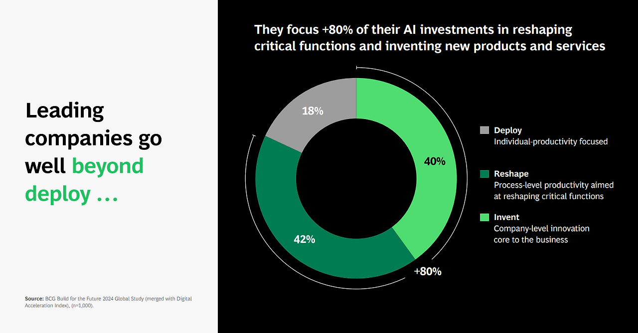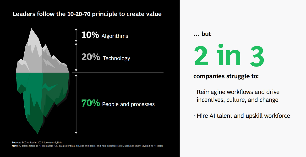 기업들은 왜 수직적 활용에 적극적이지 않을까요? 중요하지만 어렵고 복잡한 데다 결정적으로 티가 안 나기 때문입니다. AI 도입의 성패는 1) 10%의 알고리즘, 2) 20%의 데이터 및 기술 인프라, 3) 70%의 사람, 프로세스, 문화적 변혁에 의해 결정(BCG, 2025)됩니다. 하지만 현실에서 이 공식은 정반대로 적용됩니다.