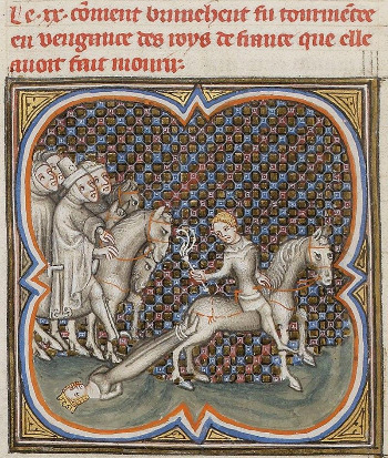 클로타르 2세는 이제 거의 70대였던 브루느힐드를 사로잡았습니다. 그리고 그녀에게 메로빙거 왕가의 많은 왕족들의 살해에 대한 죄목을 열거했으며 그녀의 팔을 말꼬리에 매달고 말을 달리게 해서 죽게 말들었으며 시신을 들판에 방치해서 모욕을 줬다고 합니다.
